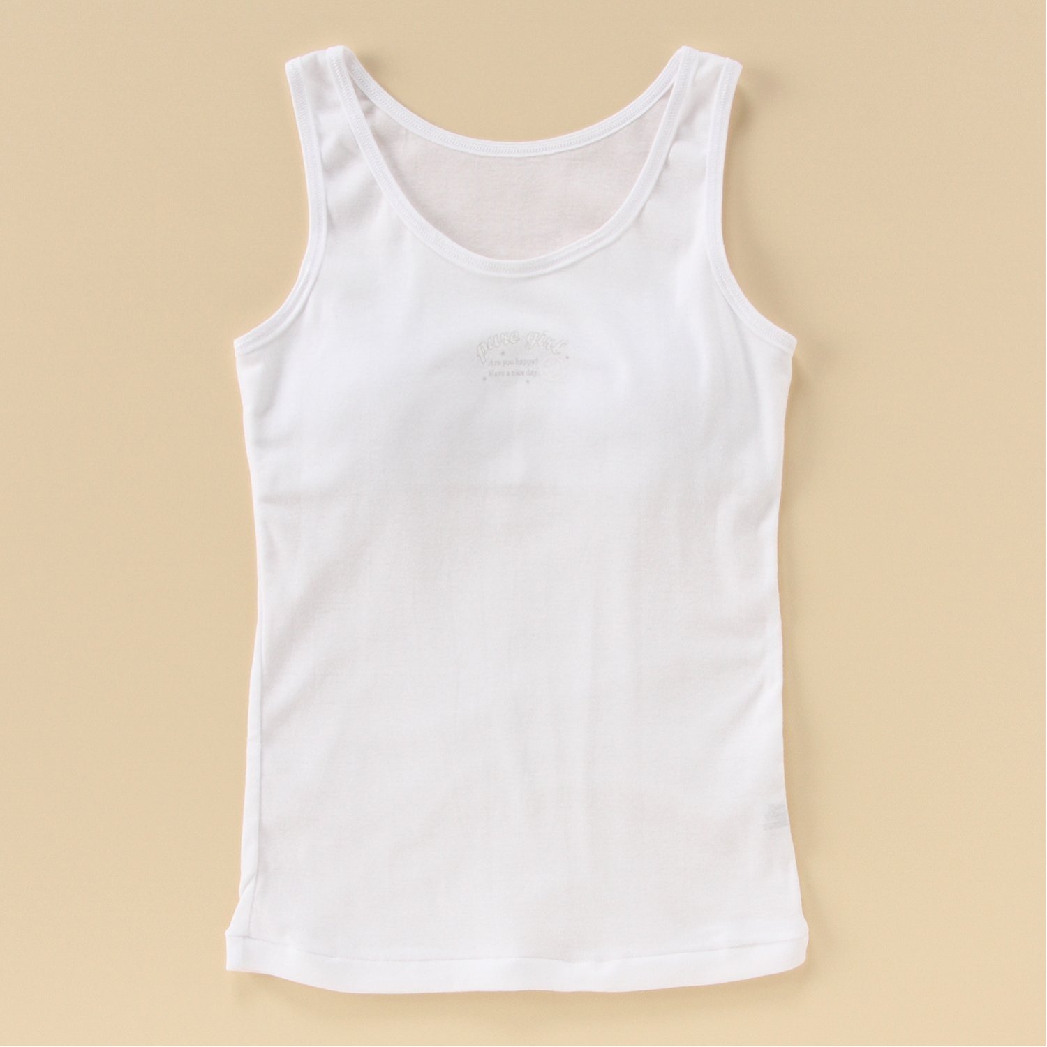 【こだわりのポイント】・成長期のバストをやさしく守るカップ付き・身生地にはお肌にやさしい綿100%素材を使用・締め付け感の少ない設計で、快適な着用感胸元にラメプリントをあしらった日本製タンクトップ。幅広の肩ひもでズレにくいのもうれしいポイントです。デイリーユースはもちろん、体育の時間やスポーツシーンにもおすすめ。