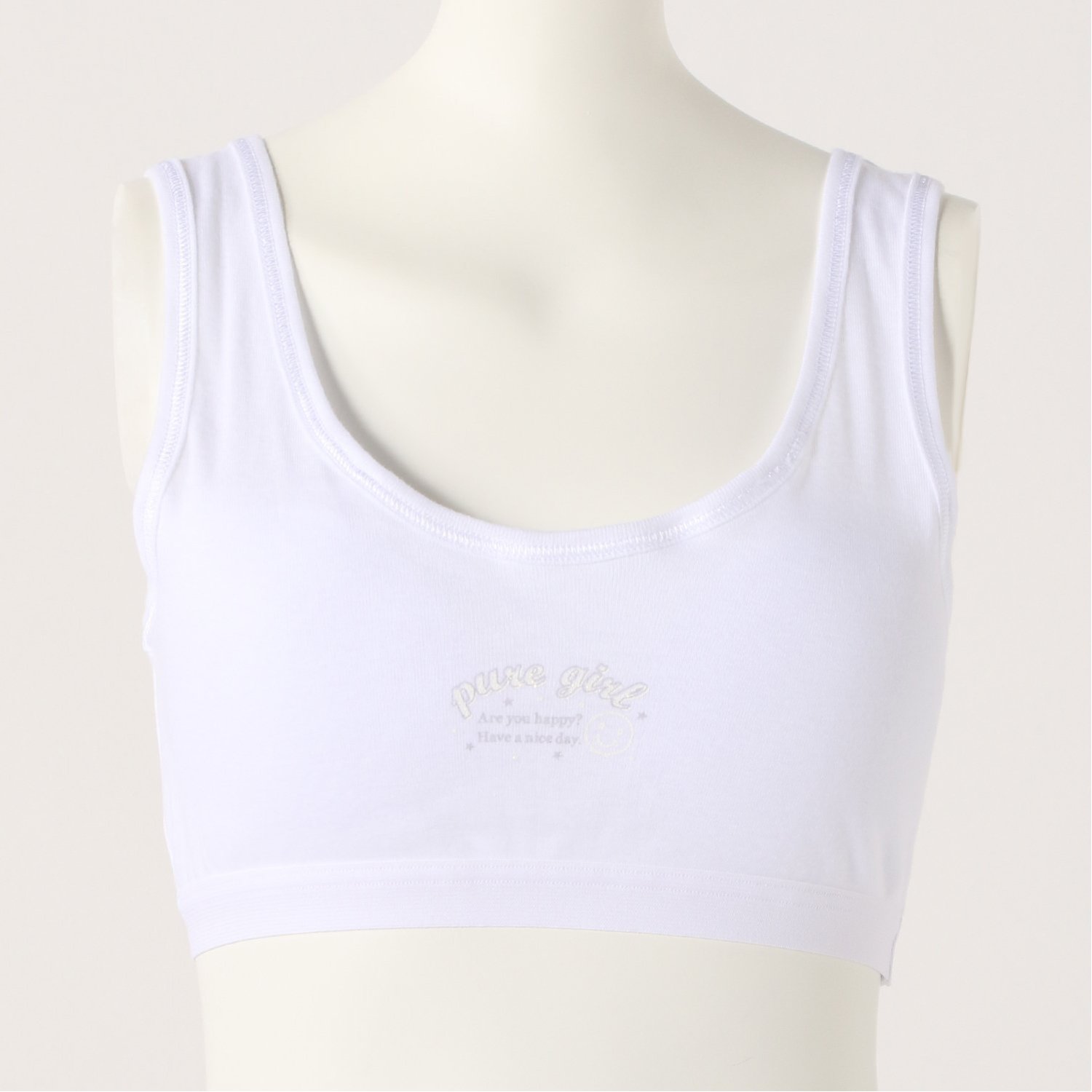 【ふくらみ始めたバストをやさしくサポート】・ノンワイヤータイプで快適なつけ心地・スムーズに脱ぎ着ができるかぶりタイプ・成長に合わせて入れ替えができるカップ付き・肌触りのよい綿100%素材を使用薄手素材を使用したオールシーズンで着用できる日本製ハーフトップ。フロントのおしゃれなプリントが女の子の気分を盛り上げます。お家時間だけでなく、部活動や体育などのスポーツシーンにもおすすめです。