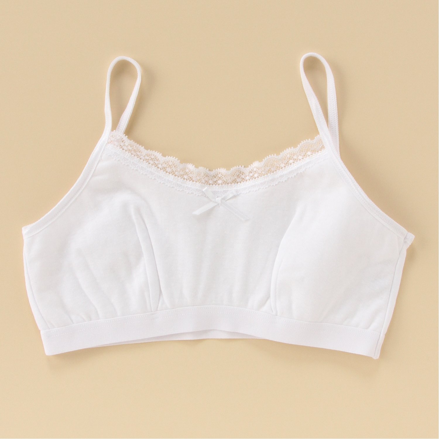【おすすめポイント】・身生地は、綿100%仕立てのやさしい肌触り・柔らかく厚みのある生地でバストをふんわりサポート・程よくフィットするアンダーゴム仕様襟元にレースとリボンをあしらった日本製のキャミハーフ。ふくらみはじめたデリケートなバストをやさしく包み込みます。