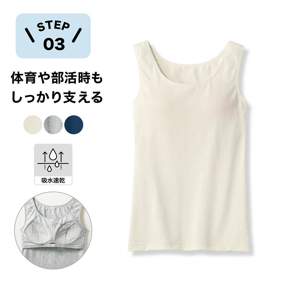 ―デザイン・スタイリング―・ブラに抵抗がある子も安心して着用できるカップ付きタンクトップ・学校にも着ていきやすいシンプルなデザイン―素材―・運動時におすすめのドライ & 消臭加工・汗をかいても乾きやすく、ニオイも気にならない―機能―・固定カップがしっかりフィット、洗濯もラクチン・ソフトなアンダーゴムがバストをやさしくホールド・通気性のよいセンターホールで運動時の動きに対応