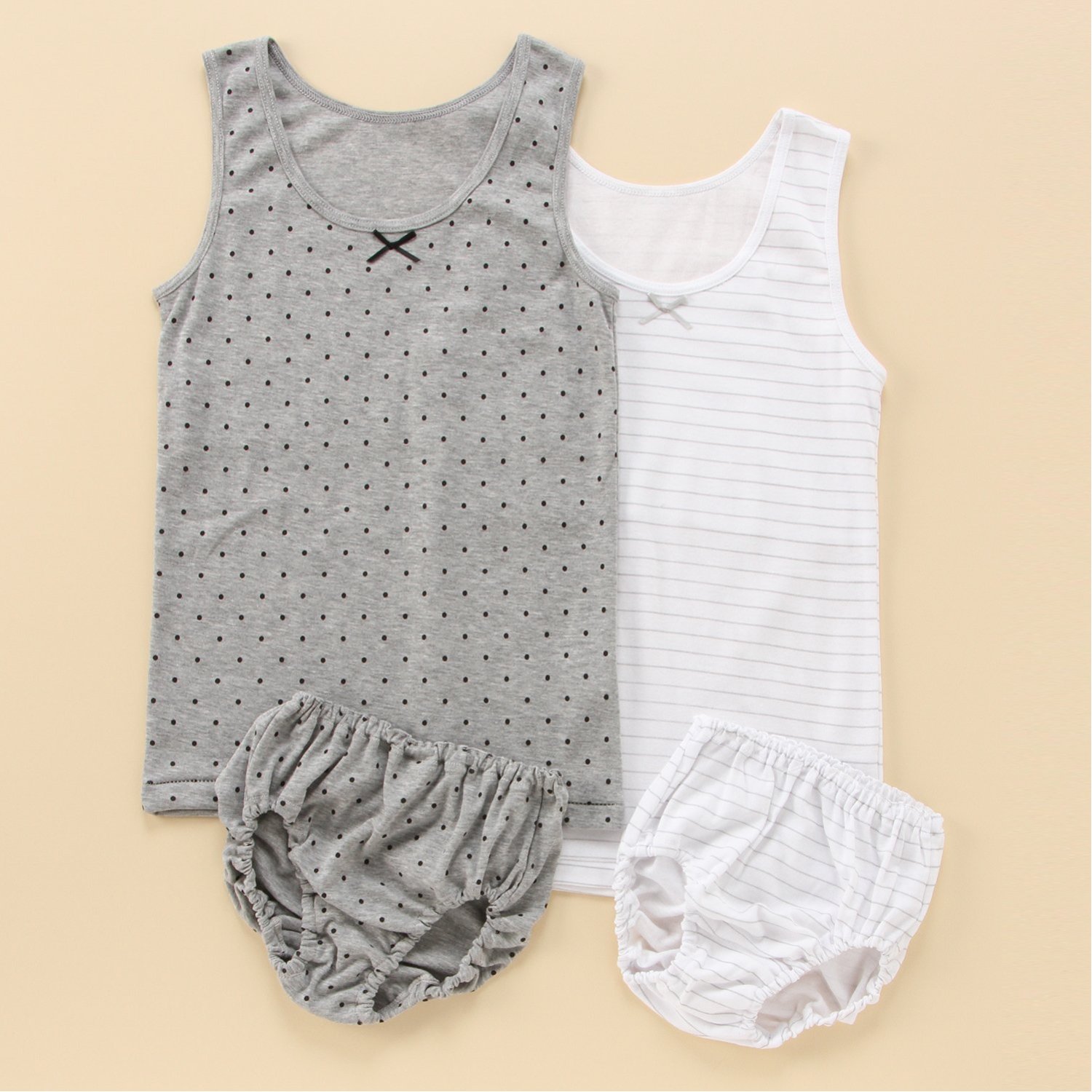 【快適な着用感が魅力】タンクトップは伸縮性のある素材・ふくらみ始めのバストをやさしくカバーする胸二重仕様・はき口 & 足口はゴム仕様で適度なフィット感【こだわりのポイント】・洗い替えにうれしい2ペアセット・内側には名前が記入できるネームタグ付きデイリーユースにおすすめのタンクトップ & ショーツ。ドット柄とボーダー柄の2柄をご用意しました。胸元にリボンモチーフを施し愛らしさをプラス。