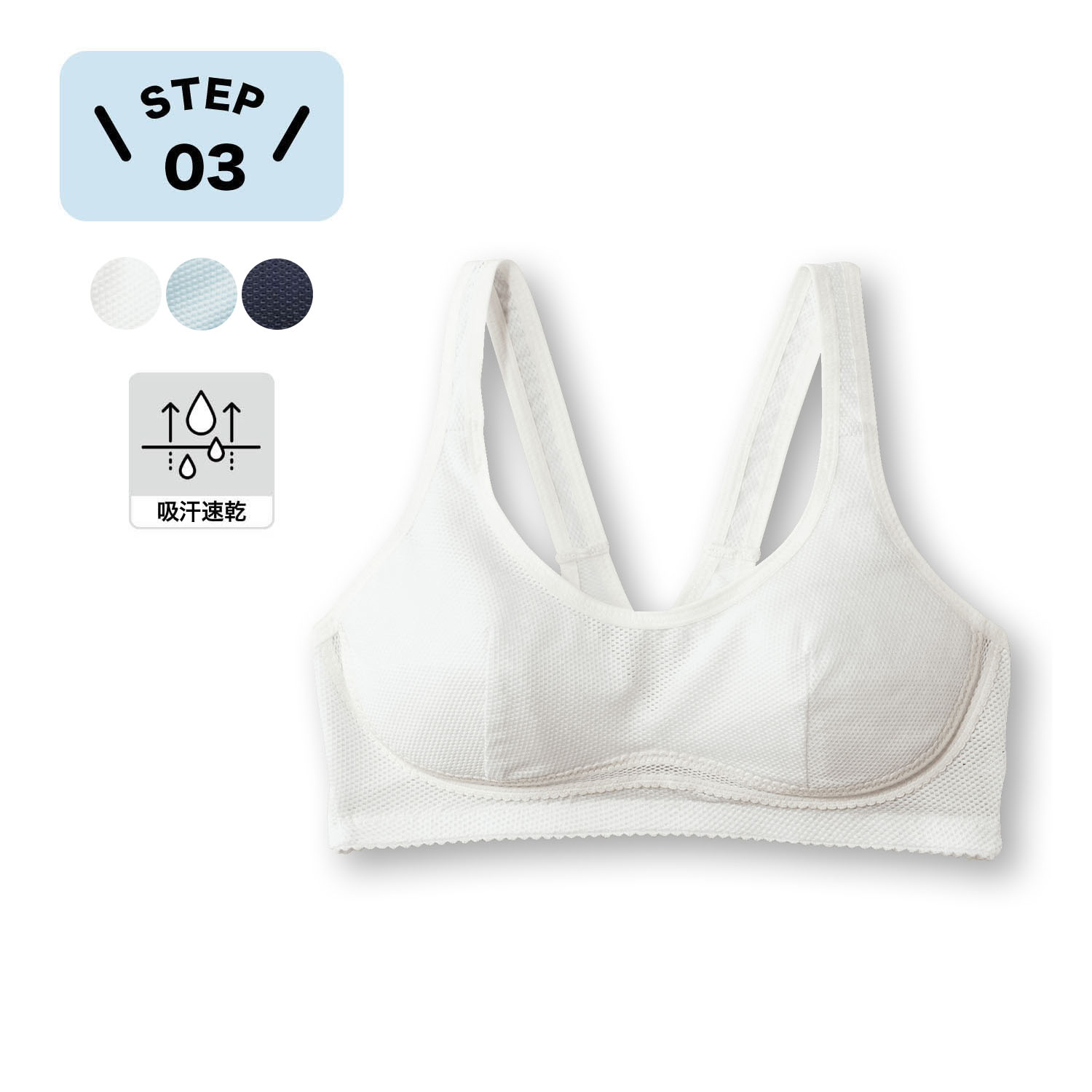 ―デザイン・スタイリング―・成長期のバストを優しく包み込むハーフトップ・汗をかいてもサラリとした肌あたり・体育や部活、遊びなど、体を動かすシーンにも最適・肩ひもがずれにくい設計・学校でも使いやすい清潔感のあるシンプルなデザイン―素材―・身生地とカップ裏は吸汗速乾素材を使用・メッシュ素材の目が粗く、通気性に特化部活ブラテニス・バレーボール・バトミントン・バスケットボール・ソフトボール・卓球など、試合や毎日の練習の時に大活躍!