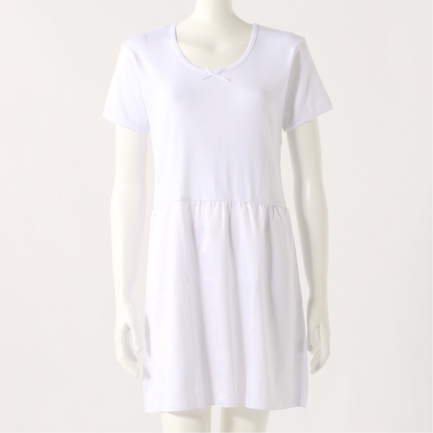【こだわりのディテール】・上部にはやさしい肌触りの綿100%素材を使用・スカート部にはショーツのラインが響きにくい素材・内側にはお名前が記入できるスペース付き胸元の小さなリボンが愛らしいアクセントを添える半袖スリップです。ワンピースなどのインナーにおすすめです。