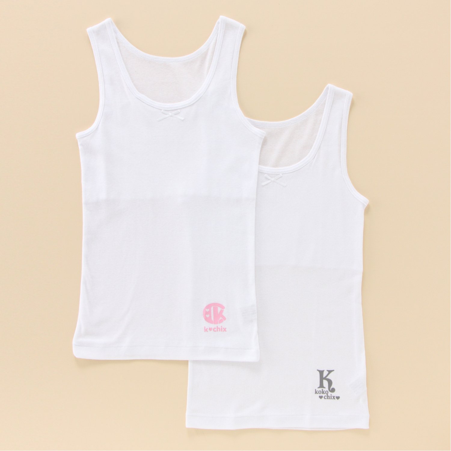 【こだわりのポイント】・お子様のお肌にやさしい綿100%素材・吸水速乾性のある特殊な紡績糸を採用・内側にはお名前が記入できるスペース付き・洗い替えに便利な2枚組をご用意ふくらみ始めのバストをやさしくカバーする、胸2重仕立てのタンクトップです。胸元のリボンや左裾にあしらったロゴが愛らしいポイントに。吸水速乾性があり、通学はもちろん運動時にもおすすめ。
