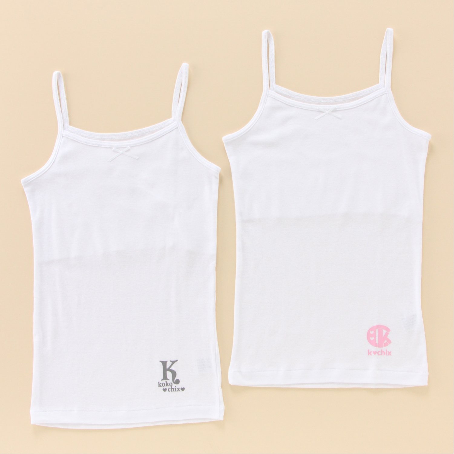 【こだわりのポイント】・お子様のお肌にやさしい綿100%素材・吸水速乾性のある特殊な紡績糸を採用・内側にはお名前が記入できるスペース付き・洗い替えに便利な2枚組をご用意ふくらみ始めのバストをやさしくカバーする、胸2重仕立てのキャミソールです。胸元のリボンや左裾にあしらったロゴが愛らしいポイントに。吸水速乾性があり、通学はもちろん運動時にもおすすめ。