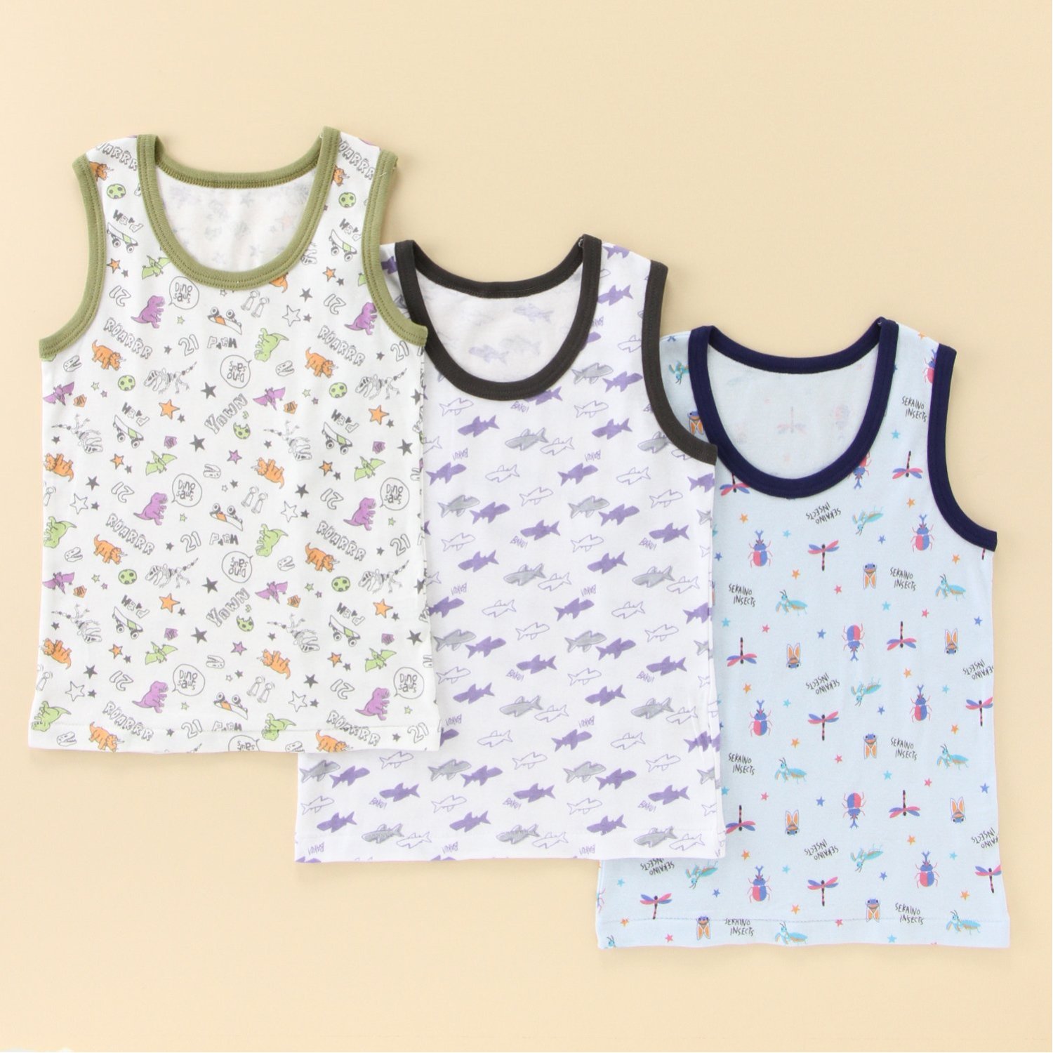 【こだわりのポイント】・やさしい肌触りの綿100%素材を使用・内側にはお名前が書けるネームタグ付き・洗い替えに便利なうれしい3枚組オールシーズン使いやすい総柄タンクトップです。柔らかな風合いで快適な着心地を後押し。通園や通学にもおすすめです。