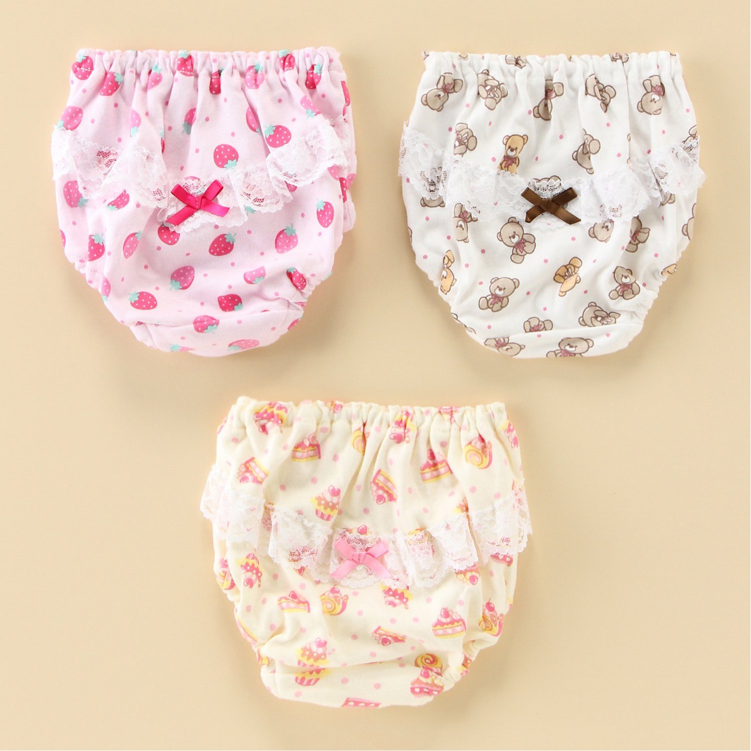 【おすすめのポイント】・肌触りの良い柔らかな綿100%素材・はき口 & 足口が内ゴム仕様でやさしくフィット・内側にお名前が記入できるネームタグ付き・洗い替えに便利な3枚組をご用意いちご、くま、スイーツモチーフのデザインがかわいい総柄ショーツです。おしりにレースをあしらい可愛さを後押し。異なる3柄でローテーションが楽しめるのもポイントです。