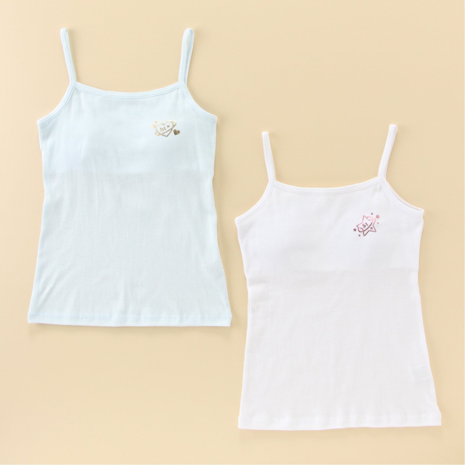 【おすすめのポイント】・取り外しもできるカップ付き・肌触りのやさしい綿100%素材を使用・内側にお名前が記入できるネームタグ付き・洗い替えにうれしい2枚組をご用意ふくらみはじめたバストをやさしくカバーする、カップ付きキャミソールです。女の子らしいプリントデザインで気分アップ。デイリーユースにおすすめです。