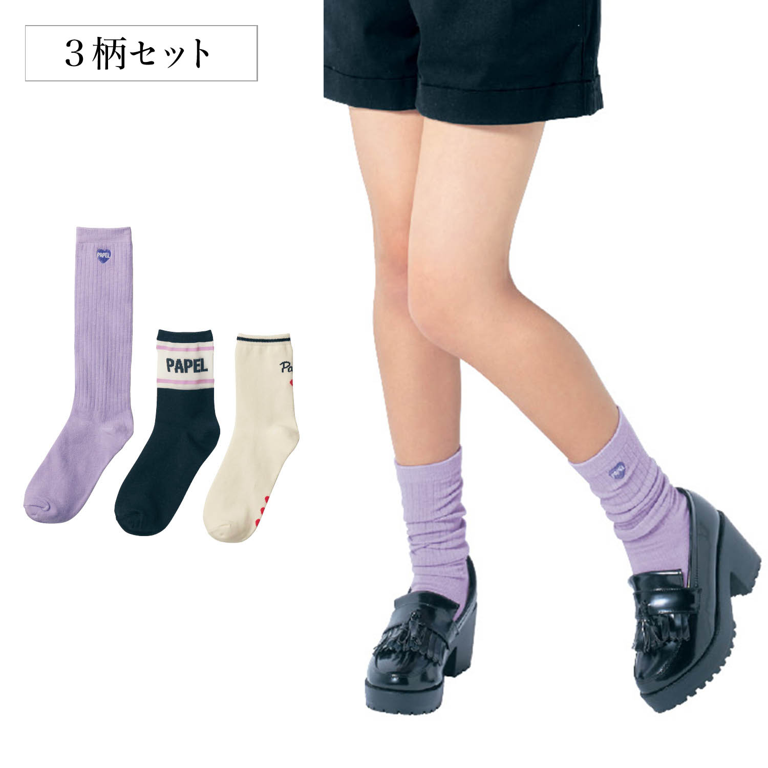 太めリブのルーズ、シースルーロゴ、ラインプリントとトレンド感のあるデザインを揃えたセット。コーデの仕上げに投入すればおしゃれ度アップもお手のもの。丈感とデザインが違うから、コーデや気分でチョイスして。【おすすめポイント】柄違いの3足セットでお得感たっぷりコーデに合わせやすいガーリーデザインリブソックスはくしゅっと落としてはくのが今っぽいオフホワイトはハートの足底プリント入りPapel lapiz(パペルラピス)ワタシの「好き」にフィットする、トレンドをおさえた好感度の高いおしゃれを提案するブランド。今のリアルなジュニア & ティーンの体形に合わせた独自のサイズを設定し、細部の着心地にもこだわりました。