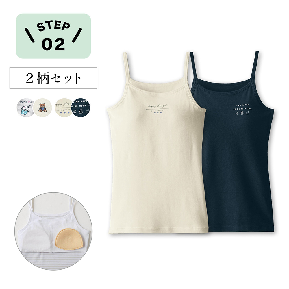 ―デザイン・スタイリング―・取り外しできるカップが付いたキャミソール2枚組・今っぽいロゴががアクセントのシンプルなセットとガーリーなセットを展開・外にひびきにくいのでブラジャーは恥ずかしいというお子様にもぴったり―機能―・取り外しできるカップ付きで成長に合わせて長く使える―素材―・肌当たりの良い綿混ベア天竺素材