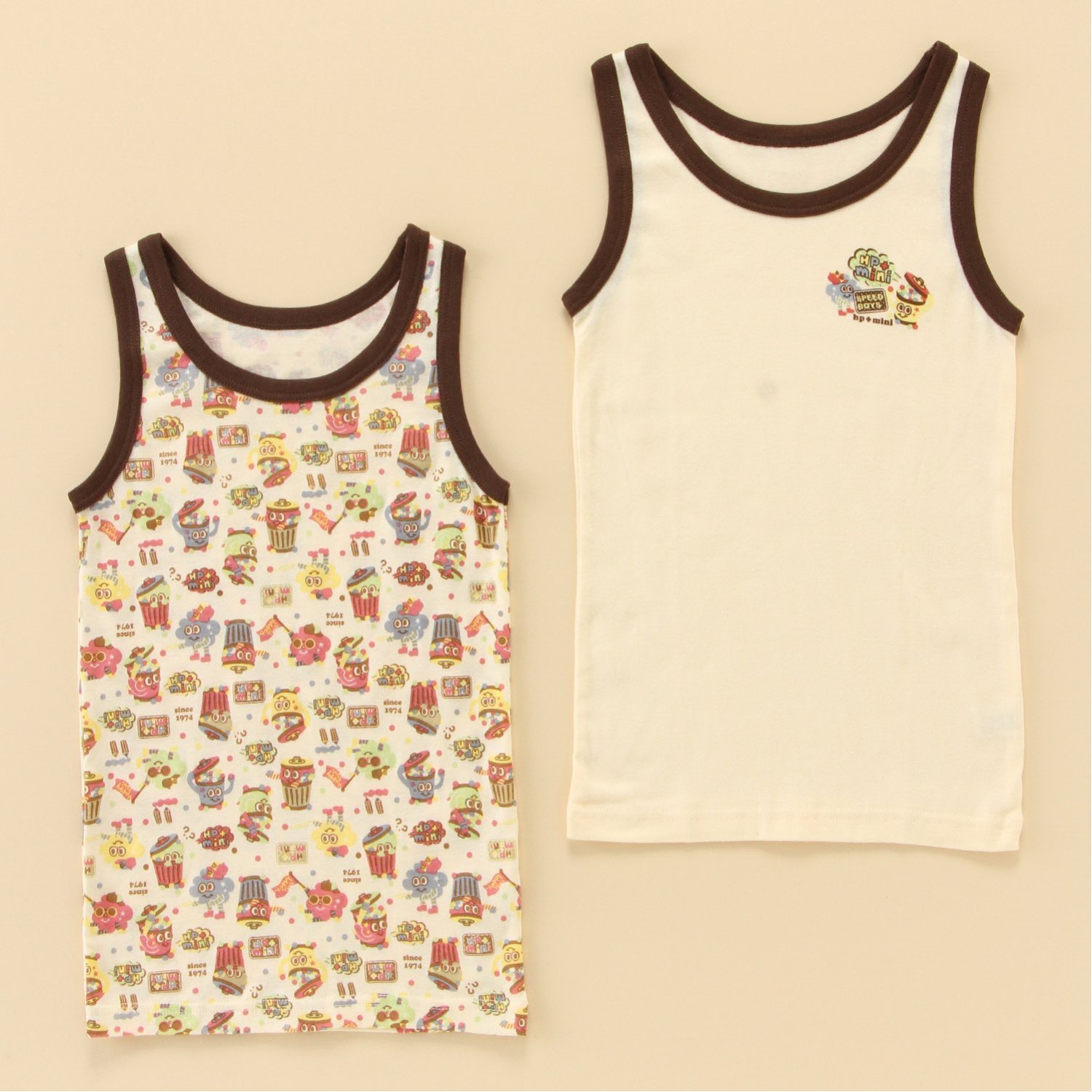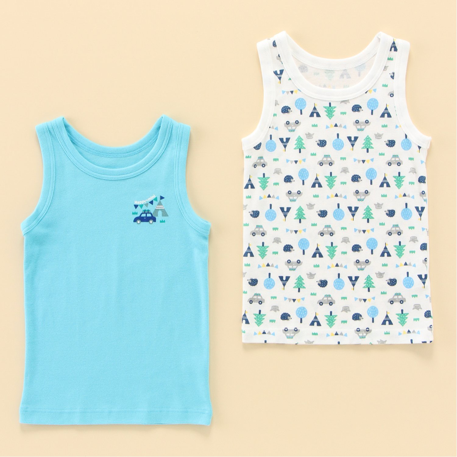 【おすすめのポイント】・お子さまらしいポップなデザイン・内側にお名前が記入できるネームタグ付き・洗い替えにうれしい2枚組をご用意やさしい肌触りの綿100%素材で仕上げたランニングです。1年を通して着用できる薄手素材。デザイン違いの2枚セットで、デイリーユースに活躍します。