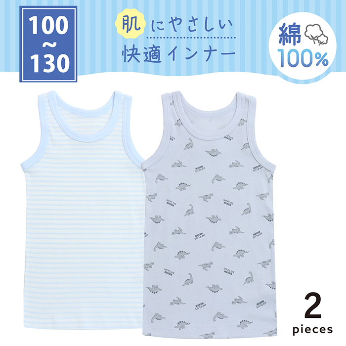 ―デザイン・スタイリング―・男の子らしい雰囲気のボーダーや飛行機モチーフ柄・襟ぐり & アームホールのパイピングがアクセントに・洗い替えに便利なうれしい2枚組―素材―・オールシーズン快適に着用できる綿100%素材―機能―・お名前記入ができるネームタグ付き