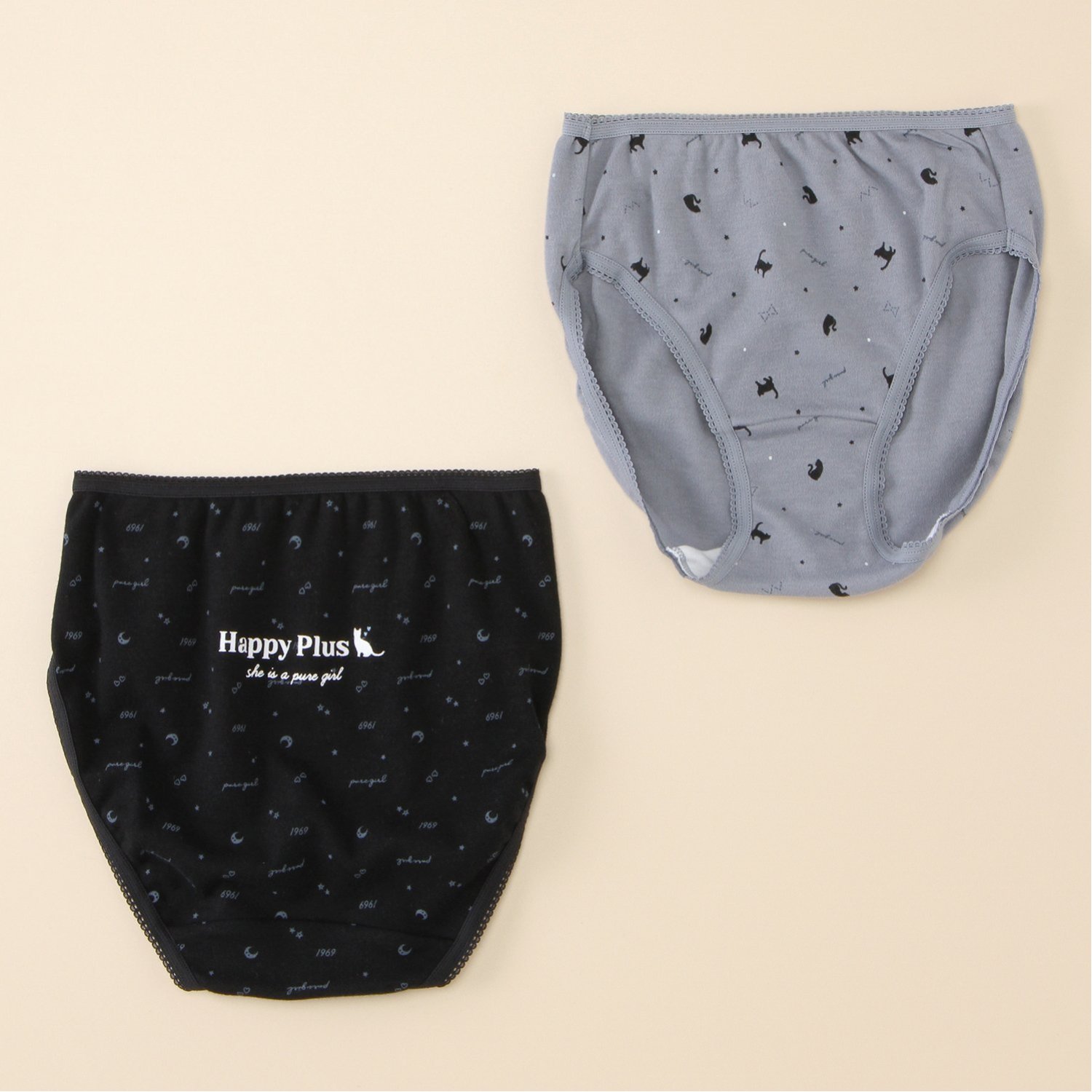―デザイン・スタイリング―・ネコや三日月モチーフの総柄ショーツ・ピコレースが愛らしいアクセントに・洗い替えに便利な2枚組をご用意―素材―・身生地はお肌にやさしい綿100%素材を使用―機能―・内側にはお名前が記入できるラベル付き