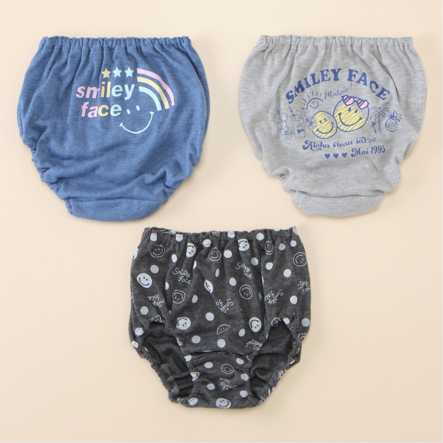―デザイン・スタイリング―・キュートなスマイリーフェイスプリント・それぞれ異なる柄でローテーションが楽しめるのが◎―素材―・ソフトな風合いの綿混素材を使用―機能―・お名前記入ができる内側ネームラベル付き・ゴムが直接肌に当たらないインゴム仕様