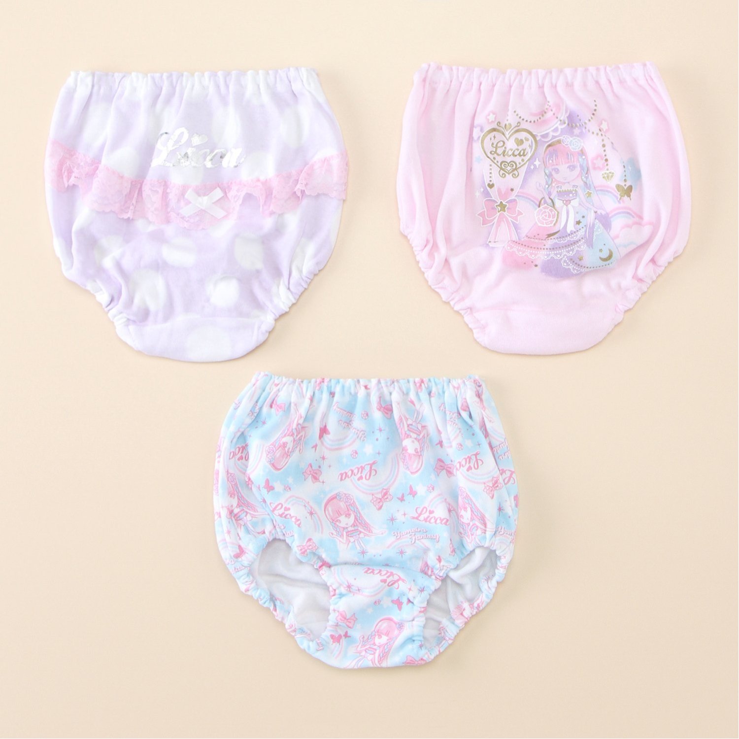 ―デザイン・スタイリング―・女の子が大好きなリカちゃんモチーフのショーツ・ゆめかわいいプリントやレース使いがキュート・ローテーションができる柄違いの3色セット―素材―・身生地はお子さまのお肌にやさしい綿100%素材―機能―・お名前記入ができる内側ネームラベル付き・ゴムが直接肌に当たらないインゴム仕様
