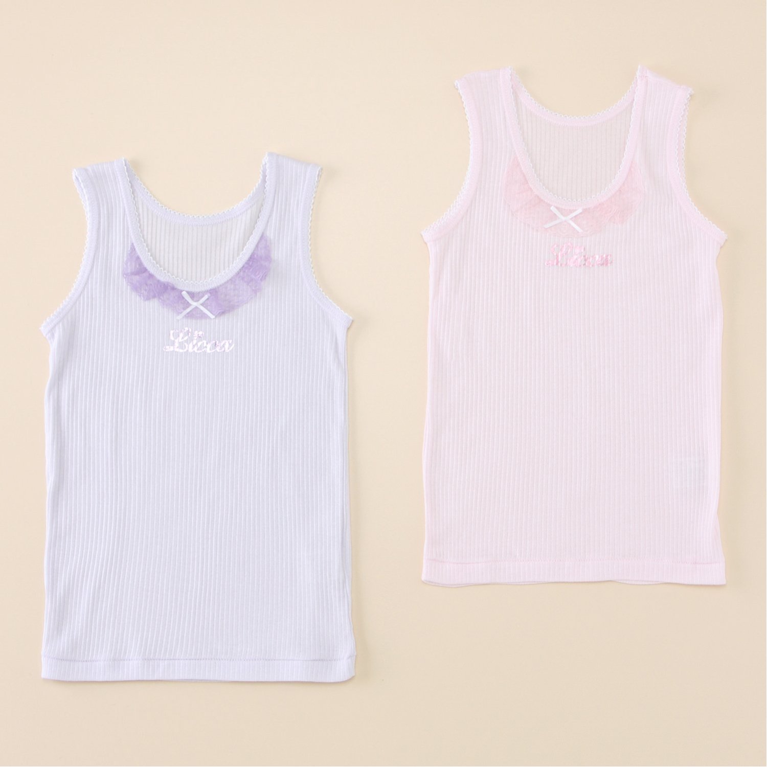 ―デザイン・スタイリング―・襟元にはふんわりレース & リボンモチーフ・キラリと煌めく箔プリントがアクセントに・洗い替えに便利な2色セット―素材―・本体は綿100%素材を使用した伸縮性のあるリブ生地―機能―・お名前が記入できる内側ラベル付き