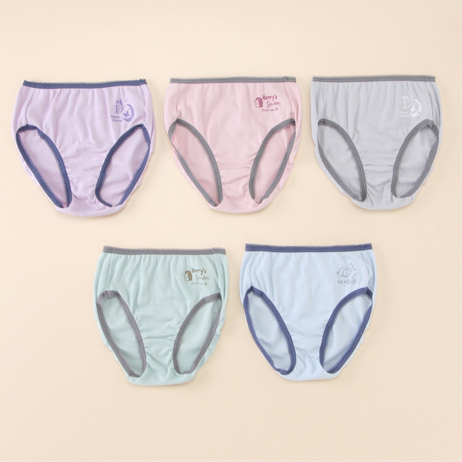―デザイン・スタイリング―・かわいらしいモチーフプリントをあしらったショーツ・はき口 & 足口の配色使いやピコレースがアクセントに・おしゃれなくすみカラーの5枚組をご用意―素材―・本体にはやさしいはき心地の綿100%素材―機能―・名前が記入でき紛失防止に役立つラベル付き