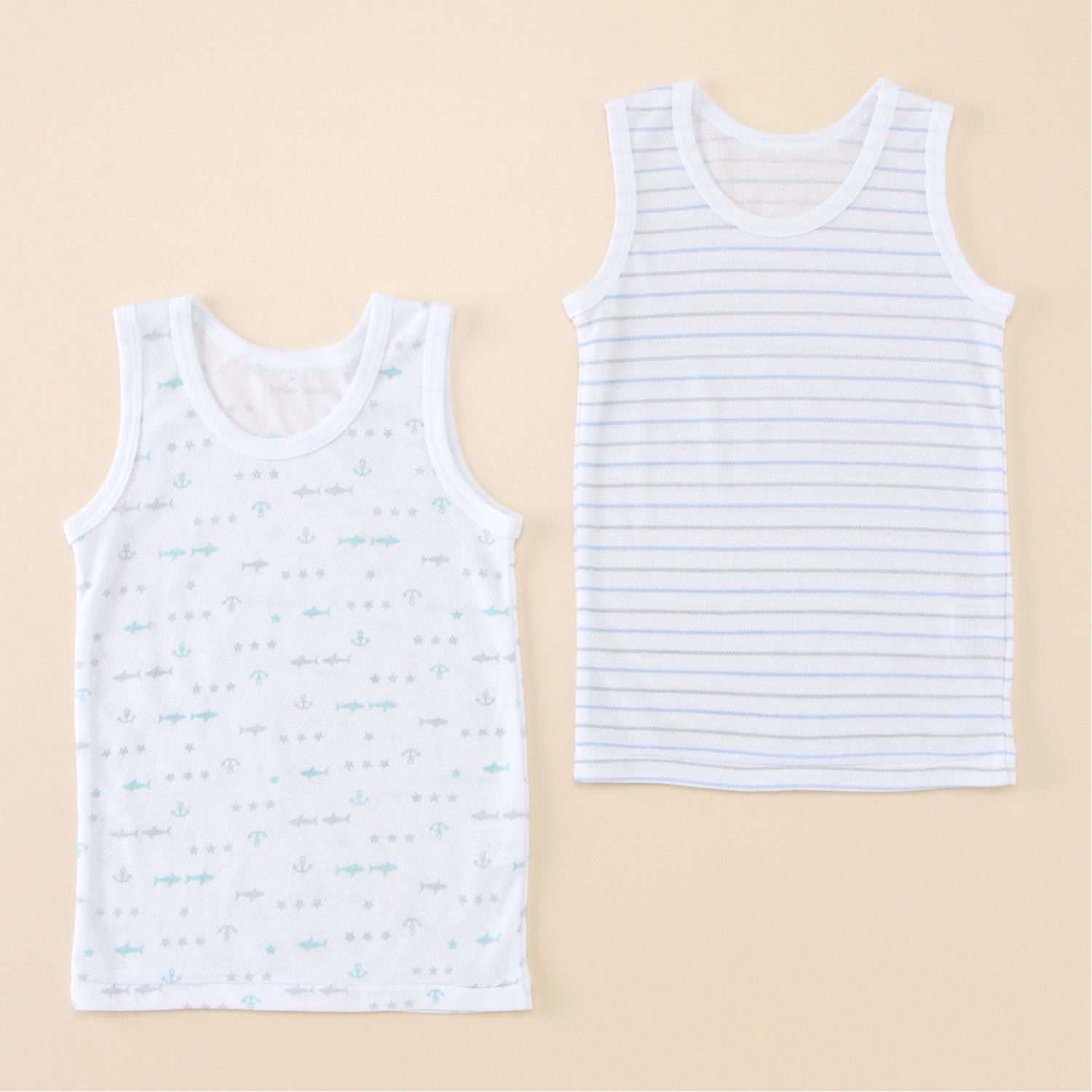 ―機能―・ムレにくく通気性のよいメッシュ生地・吸水速乾性があり、ドライな着心地をキープ・お名前が記入できる内側ラベル付き―デザイン・スタイリング―・マリンテイストなかわいらしいタンクトップ・洗い替えに便利なうれしい2枚組―素材―・ナチュラルな風合いの素材を使用