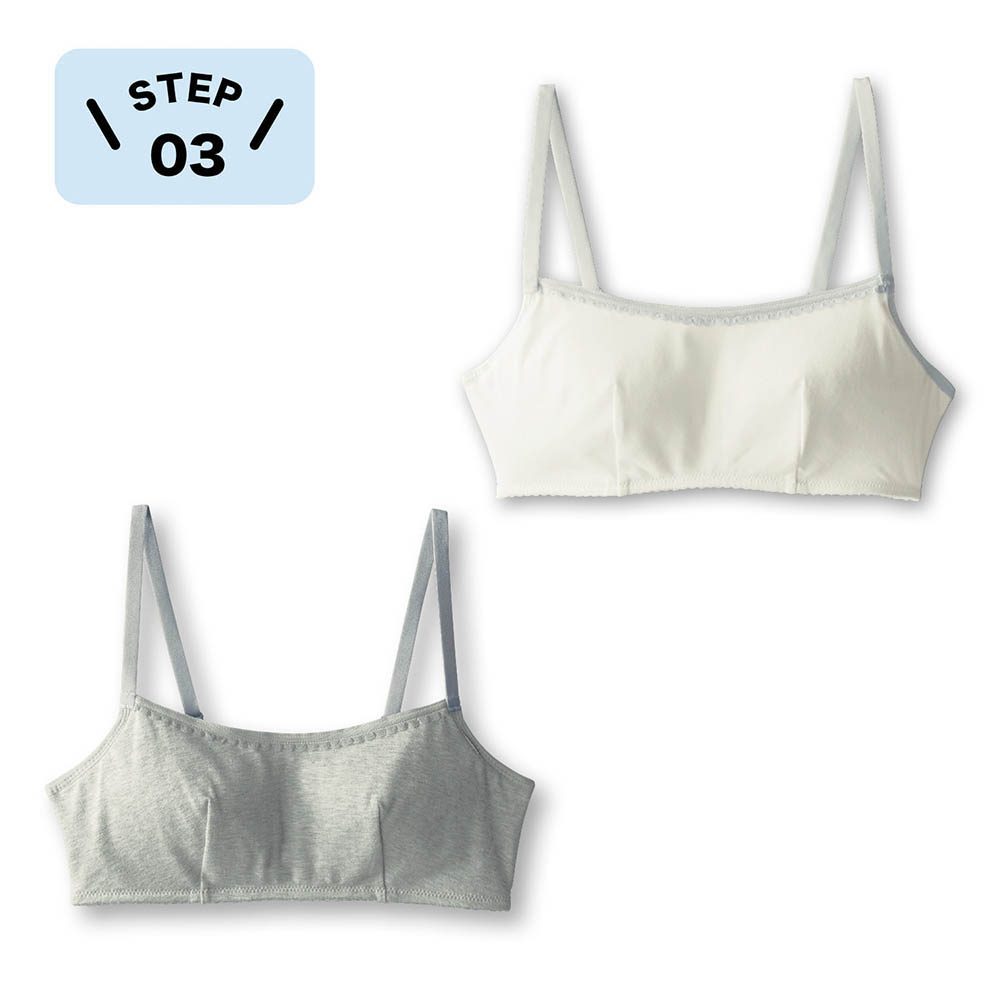 ―デザイン・スタイリング―・タンクトップ風デザインで背中までカバー・ホックなしのハーフトップタイプで着脱が楽ちん・学校に着て行きやすい無地 & カラー・カップ固定で洗濯も楽ちん―素材―・カップ裏は柔らかな綿100%素材―機能―・肌あたりのよいふんわりカップを内蔵はつブラ(R)成長に伴ってバストが変化してきた女の子のインナーを導入期からサポートするファーストブラです。運動シーンだけでなく、学校生活や日常生活を含め幅広いシーンでお使いいただけます。