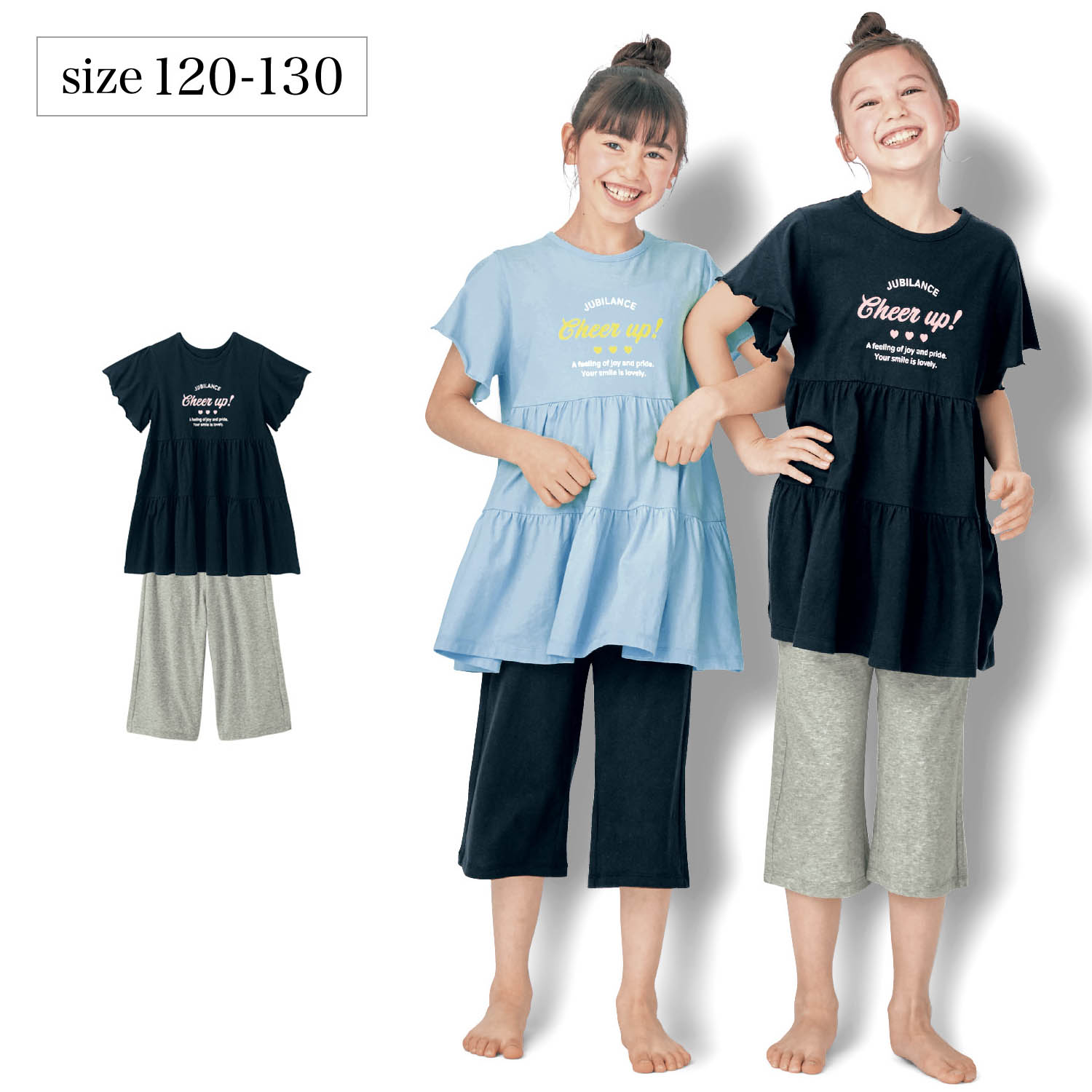 ―デザイン・スタイリング―・フレア袖と2段ティアードのひら揺れチュニック・ちょっと外に出てもOKのかわいらしさ・七分丈パンツはゆとりがありつつ、すっきりはけるシルエット―素材―・身生地はソフトな肌ざわりの綿100%天竺素材