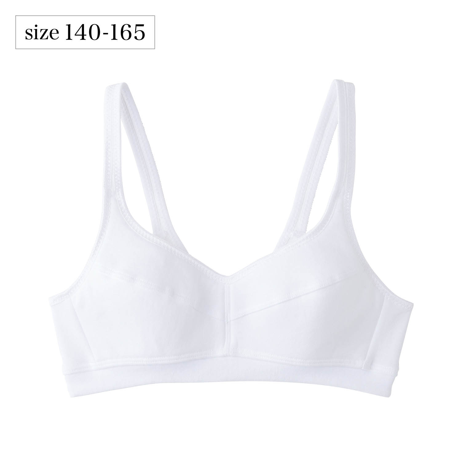 学校生活でも使いやすい白無地タイプのスポーツブラ。制服シャツに合わせやすいのも◎。・身生地はストレッチの効いた綿混素材・ストレッチ素材が体にフィットしスポーツに最適・バストトップがほんのり目立ち始めたら・胸元の切り替えがバストの形にフィット