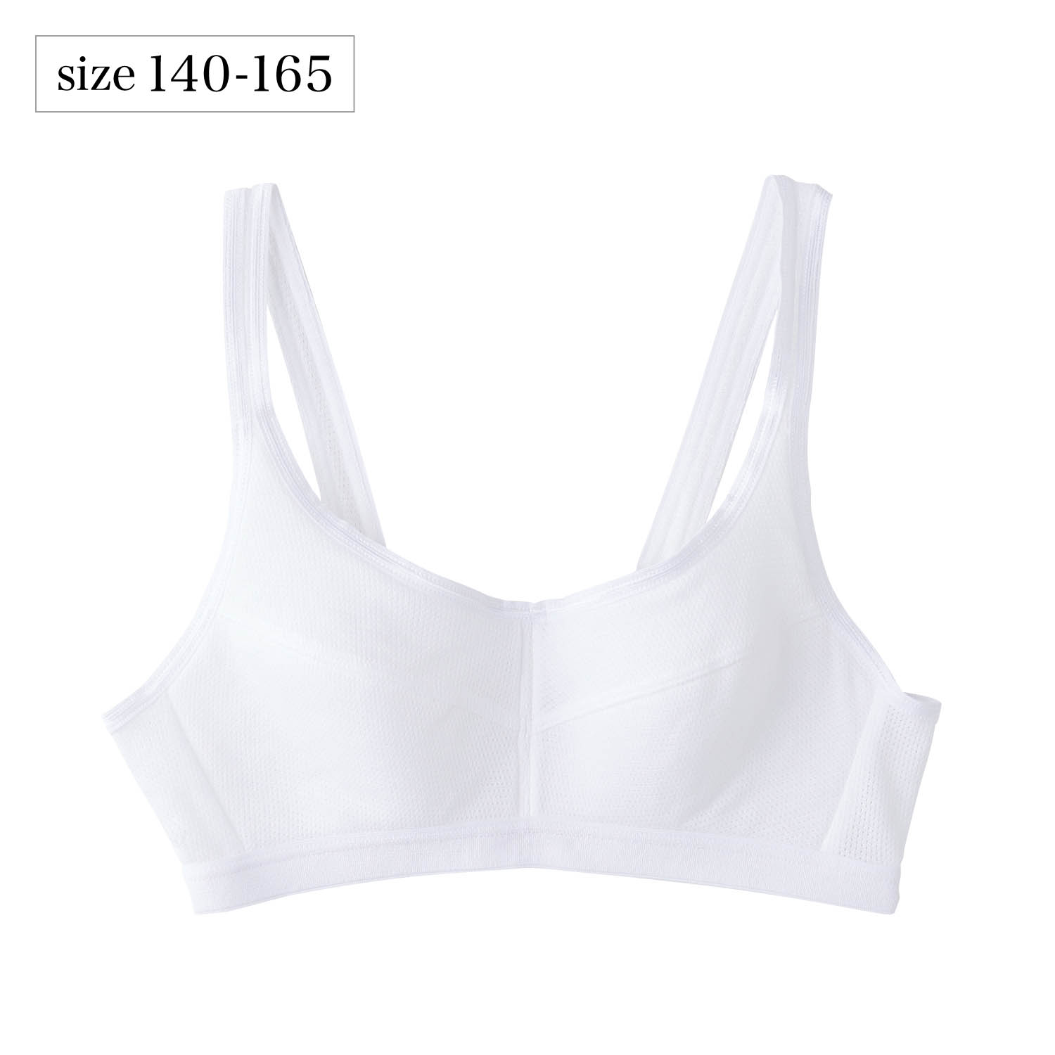 学校生活でも使いやすい白無地タイプのスポーツブラ。制服シャツに合わせやすいのも◎。・身生地は通気性のよいメッシュ素材・汗をかいてもベッタリ貼りつきにくくスポーツに最適。・綿混素材でお肌にやさしくサラサラ快適な着心地・バストトップがほんのり目立ち始めたら・胸元の切り替えがバストの形にフィット