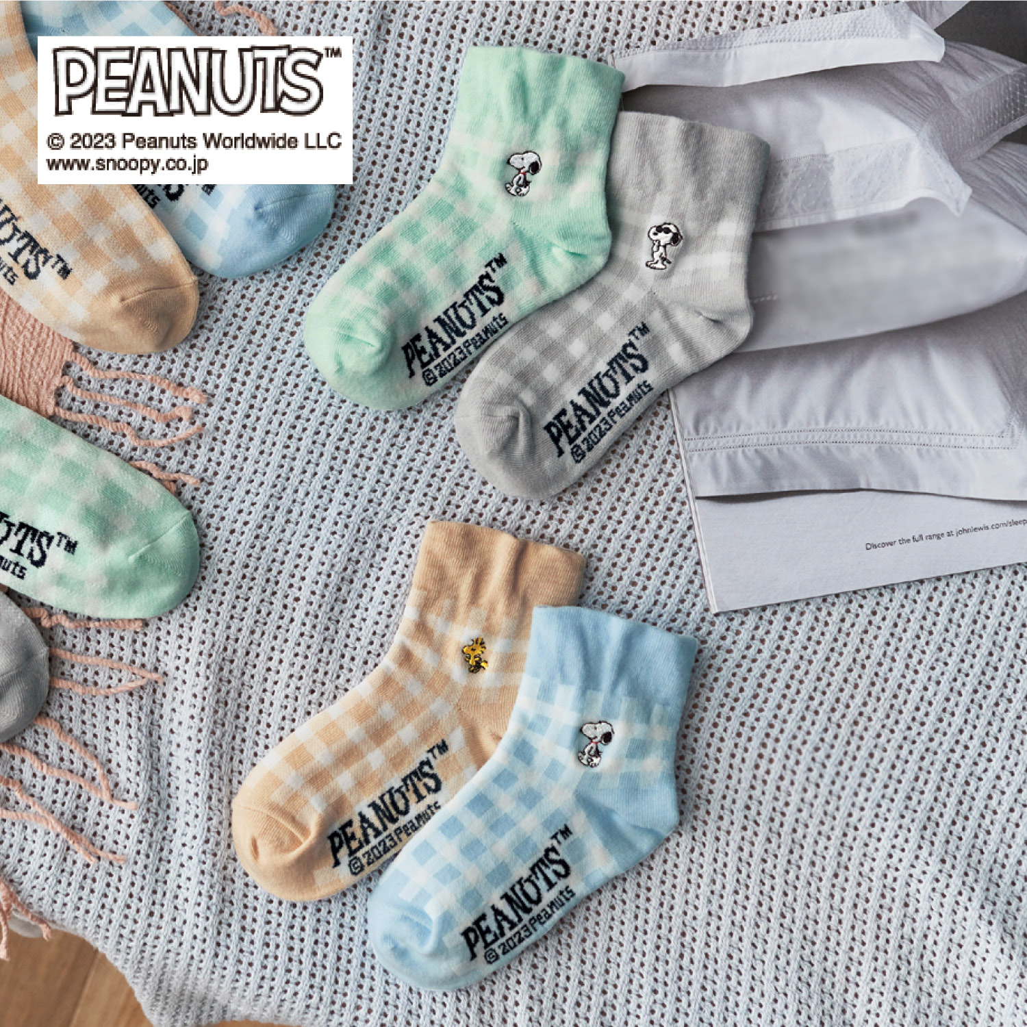 ーデザイン・スタイリングー・淡い色調のチェック柄がナチュラルなニュアンス・キャラクターの刺繍も足元のアクセントに・色味の異なる2足セットが楽しいー素材ー・ソフトな肌触りの綿混素材・程よく厚みがあって心地いい履き心地