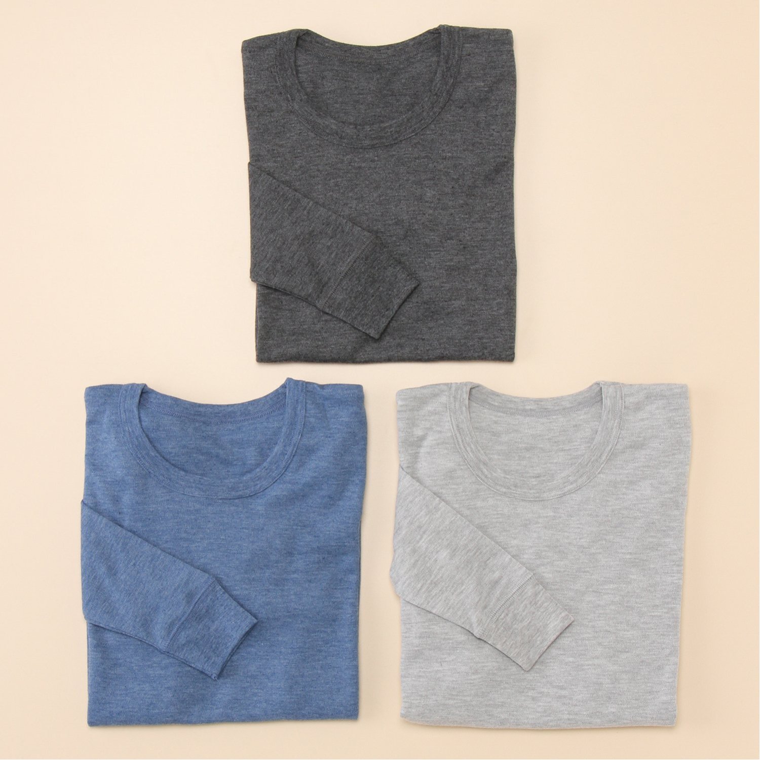 ―デザイン・スタイリング―・シンプルに仕上げた厚地の長袖インナー・ニュアンスのある杢調カラーがおしゃれ・袖口リブ仕様ですっきりした印象に・トップスと合わせやすい、色違いの3枚組をご用意―素材―・ふんわりあたたかな綿混のスムース生地―機能―・紛失防止に役立つ、お名前が書けるネームタグ付き
