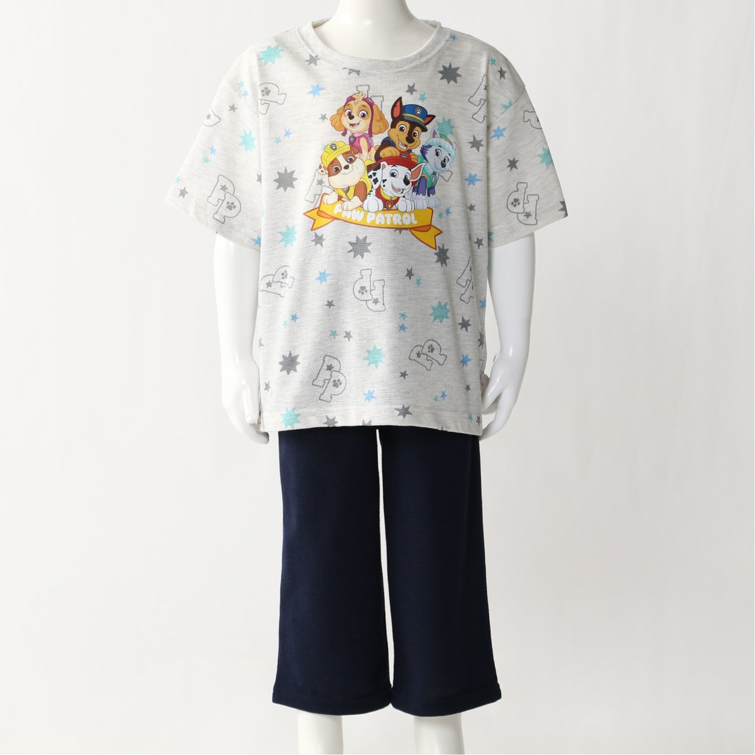 ―デザイン・スタイリング―・大人気パウ・パトロールのキャラクタープリント・リラックス感のあるドロップショルダータイプ・おやすみタイムはもちろん、お部屋着にも◎―素材―・本体は通気性のよいメッシュ天竺生地・やさしい肌ざわりの綿混素材を使用―機能―・ウエストゴム仕様ではき心地ラクチン