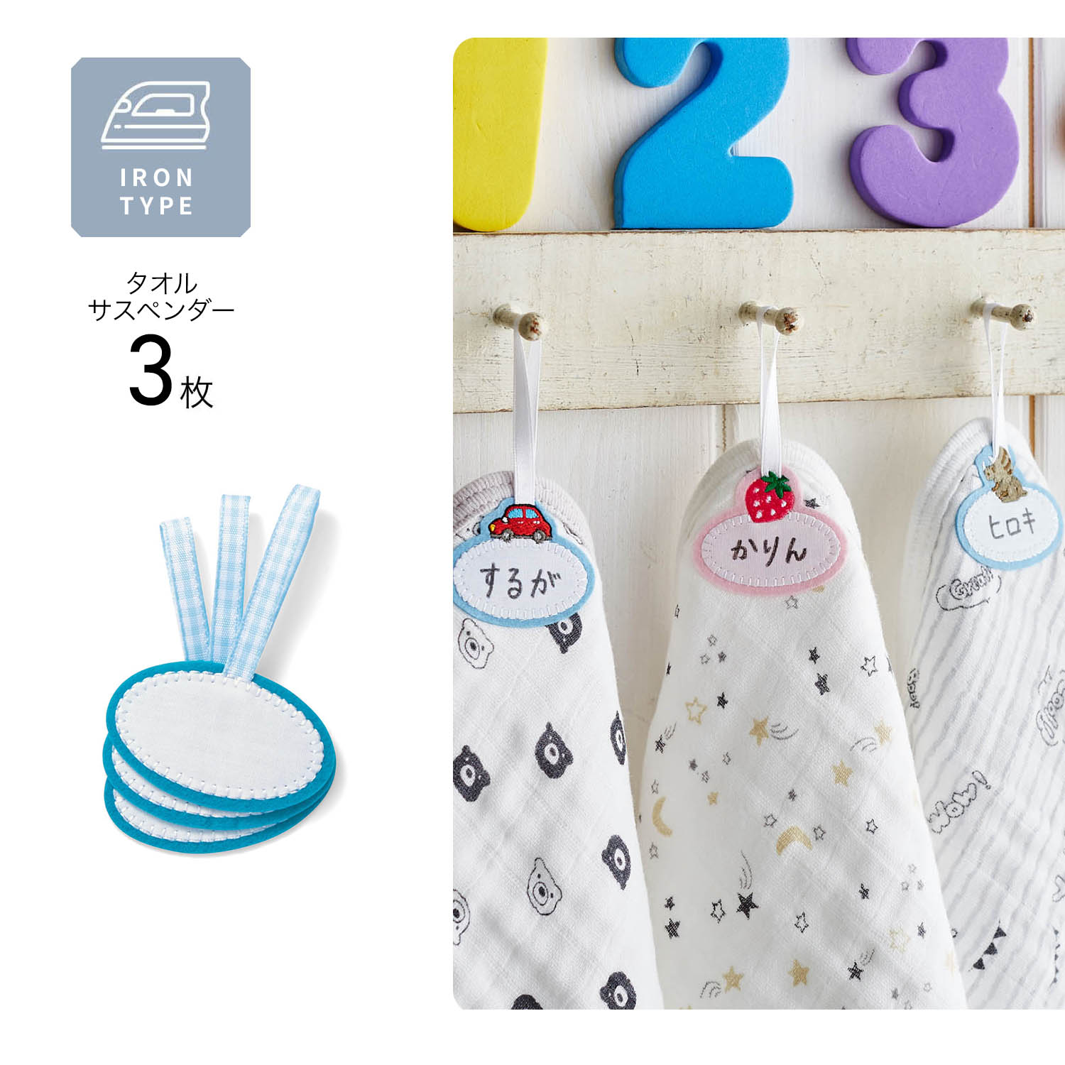 お気に入りのタオルやハンカチが便利なループ付きに早変わり。保育園や幼稚園で重宝します。取り付けもアイロンで簡単に接着できます。うれしいお名前スペース付き。洗い替えに便利な同色の3個セット。