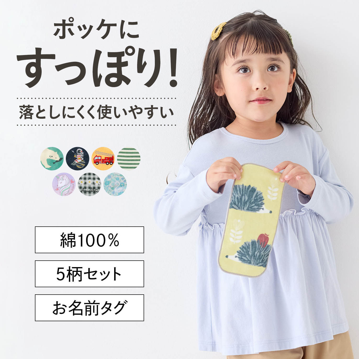 ―デザイン・スタイリング―・毎日選ぶのが楽しくなる、可愛いデザイン・洗い替えに便利な5柄セット―素材―・ふんわりやわらかく、吸水性のよい綿100%素材―機能―・子どもの手にぴったりのサイズなので、園や学校にも最適・たためばすっぽりポケットに入るサイズなのもうれしいポイント・裏にお名前スペース付き