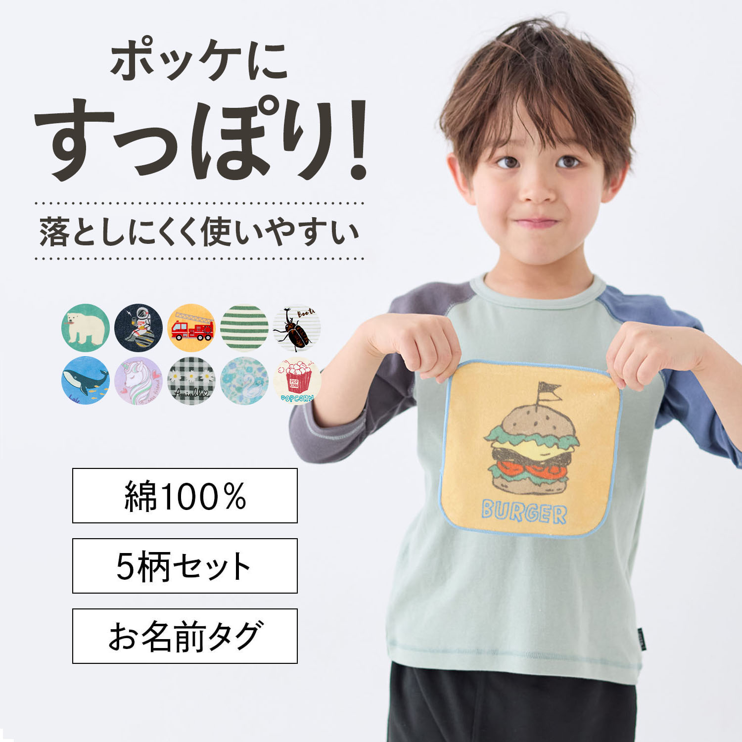 ―デザイン・スタイリング―・たためばすっぽりポケットに入るミニサイズのハンカチ・デザイン違いの5枚セットで、通園や通学用の洗い替えに便利・定番柄から可愛い総柄、動物など、豊富な色柄をご用意―素材―・ふんわりやわらかく、吸水性のよい綿100%素材・表は手ざわりソフトなカットパイル・裏は水分を吸収しやすいループパイル―機能―・裏にお名前スペース付き