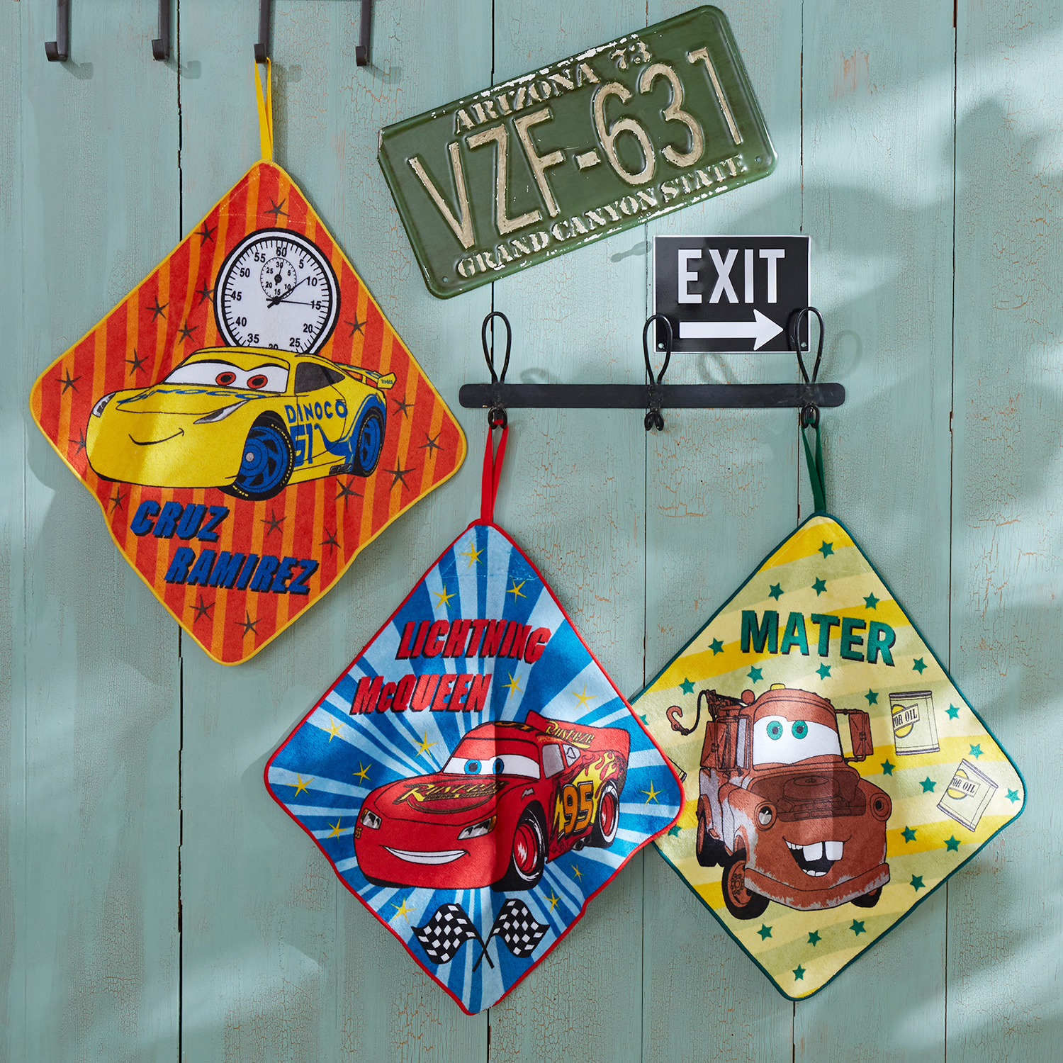3柄セットでお買い得なハンドタオル便利なループ付き保育園や幼稚園で、フックに掛けて使用OK表面はなめらかなシャーリング、裏面はループパイル素材組と名前が書けるネームタグ付き抗菌防臭加工をほどこしているので清潔ピクサーのキャラクターを柄違いの3枚セットに通園・通学におすすめ