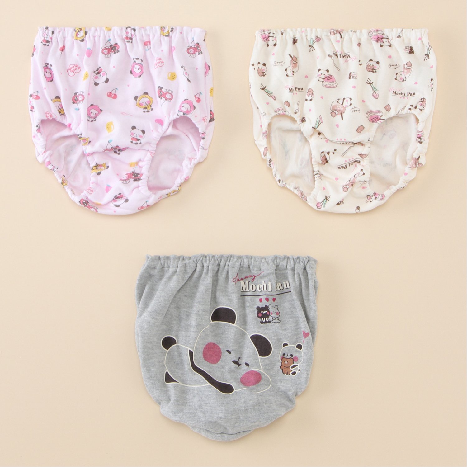 ―デザイン・スタイリング―・愛らしいもちもちぱんだのキャラクタープリント・洗い替えに便利なうれしい3枚組―素材―・総柄は綿100%、バックプリントは綿混素材を使用―機能―・はき口 & 足口はインゴム仕様でやさしくフィット・内側にはお名前が記入できるネームタグ付き
