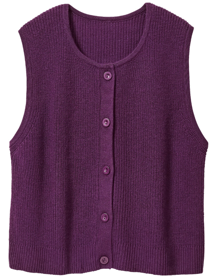 軽快な印象で動きやすく重ね着が楽しめるショート丈の前開きベスト。LOVE BODY 2023冬号 P50-3に掲載されています。