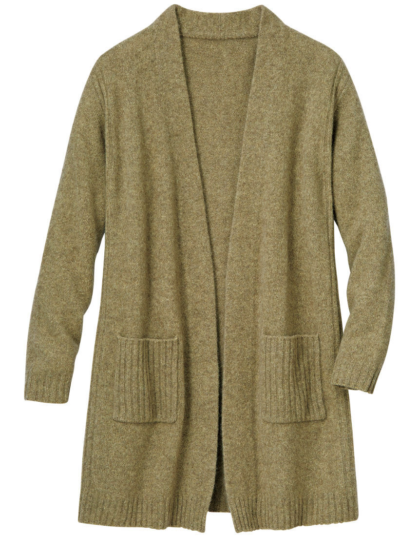 着姿すっきりの、トッパーカーディガン肩から両脇の裾ポケットのリブ編がさりげないアクセント。LOVE BODY 2023冬号 P16-4に掲載されています。