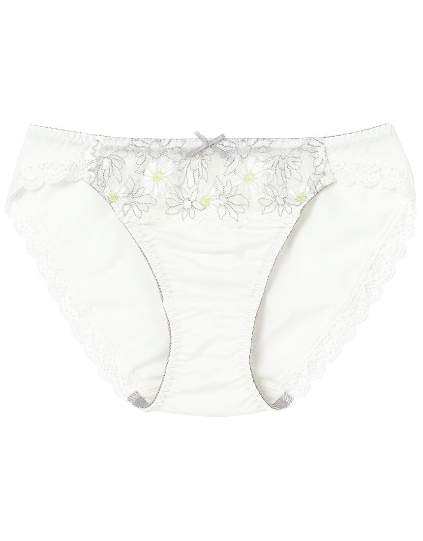 マーガレットモチーフの光沢感のある刺繍と線画の陰影が重なりあって、柄の奥行きと立体感を感じさせるエンブロイダリーレースを使用したグループ。それぞれ違った印象のカラーリングも魅力です。折り重なるように咲くマーガレットが印象的なエンブロイダリーレースをフロントにあしらったショーツ。刺繍糸の色に合わせたテープとリボンがアクセントになっています。バックの裾はストレッチレースをほどこし、くいこみにくく、アウターにひびきにくいです。