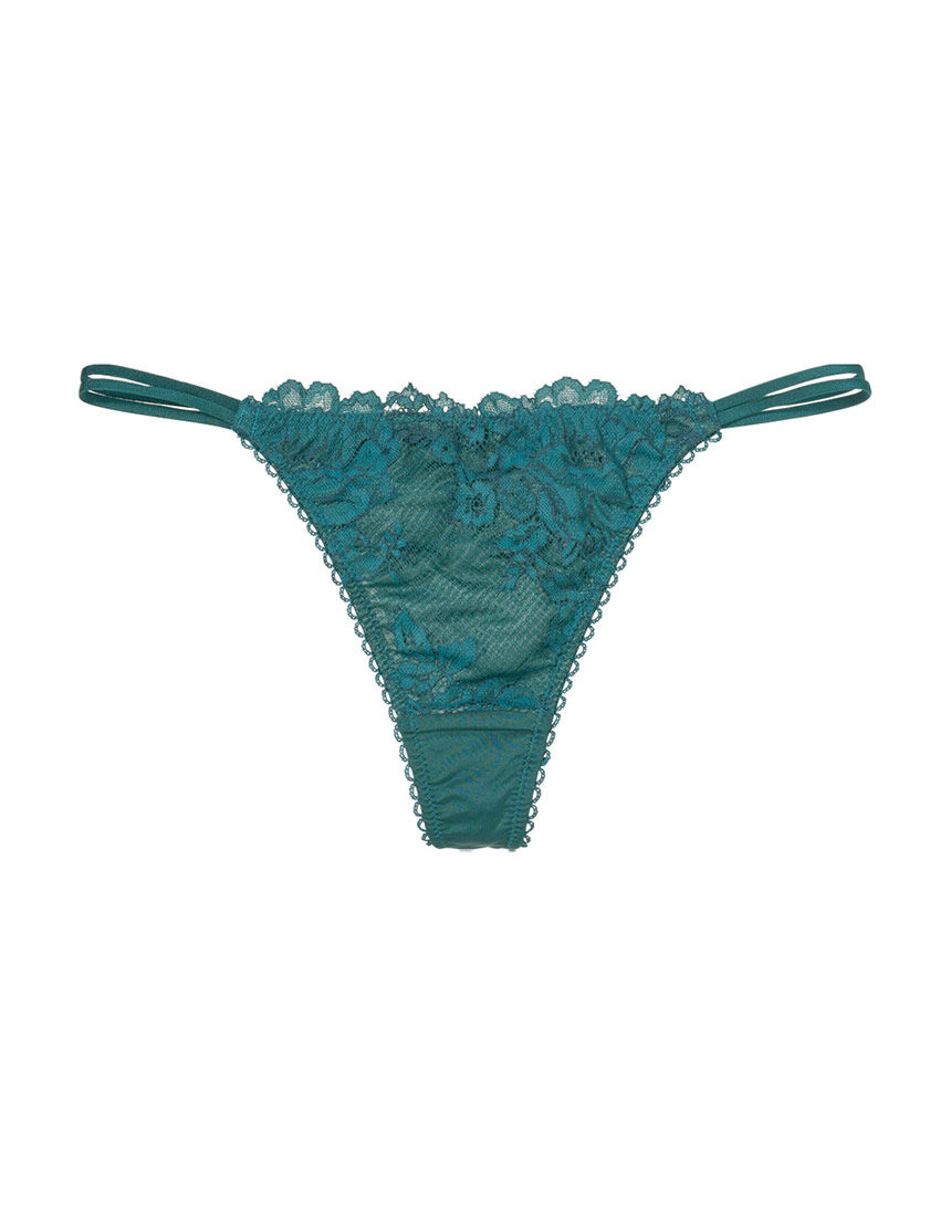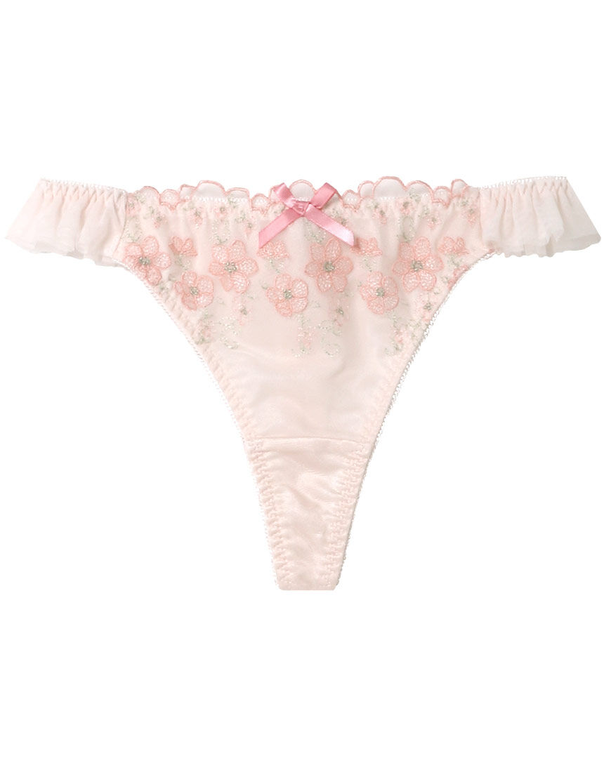 【フロント】・大輪の花柄レースに薄手の生地を裏打ちして透けにくい。・サイドは、伸縮性のある華奢なWストリング。【バック】・面積広めのストレッチ生地に、波型のストレッチレースをトリミング。・くい込みにくく優しいフィット感なので、Tバックショーツにあまり慣れていない方にもおすすめ。【はき込み】・ローライズ(浅め)