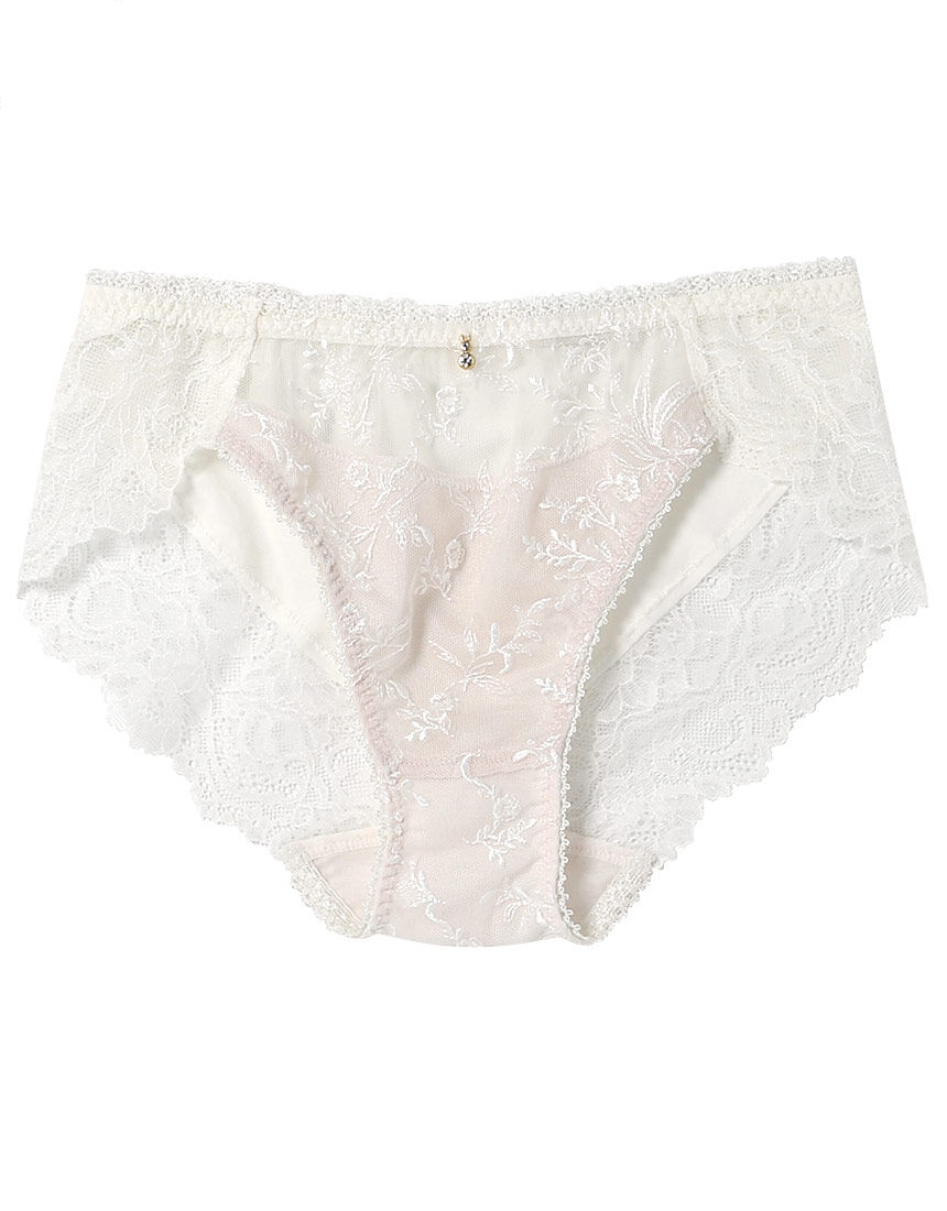 ヨーロッパで古くから愛される野草のゼラニウムをモチーフにしたレースに、透明感のあるフリルテープでひとさじの甘さをプラスした繊細なグループ。・透明感を引き出してくれるミントカラーと、ネイビーの落ち着いた色味の組み合わせでまとめたカラー【LBカラー】・肌が透けるようなピンクベージュの裏打ちに、ピュアなホワイトカラーが映えるウェディングドレスをイメージしたカラー【WHカラー】・肌なじみのよいローズピンクをベースに奥行きのあるラズベリーピンクでアクセントをつけた、大人っぽいイメージのピンクカラー【WIカラー】のカラー展開。●フロントのレースは上辺が透けるデザインで抜け感を加え、ウエストにはフリルテープをあしらったフェミニンな印象のショーツ。●バックは、はきごこちのよい縦横に伸びるベア天竺素材を使用しています。●裾にはストレッチレースをほどこし、アウターにひびきにくいです。