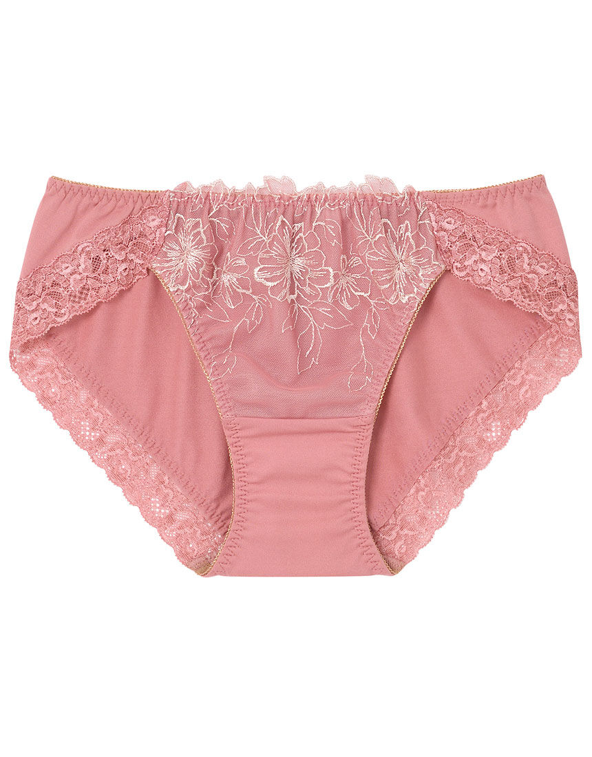 咲き誇る花が印象的なエンブロイダリーレースを使用し、大人っぽく仕上げたデザインのグループ。モノトーンカラーから肌なじみのよいカラー、フェミニンなシーズンカラーまでバリエーションを揃えました。咲き誇る花が印象的なエンブロイダリーレースをフロントにあしらったショーツ。バックの裾はストレッチレースをほどこし、くいこみにくく、アウターにひびきにくいです。