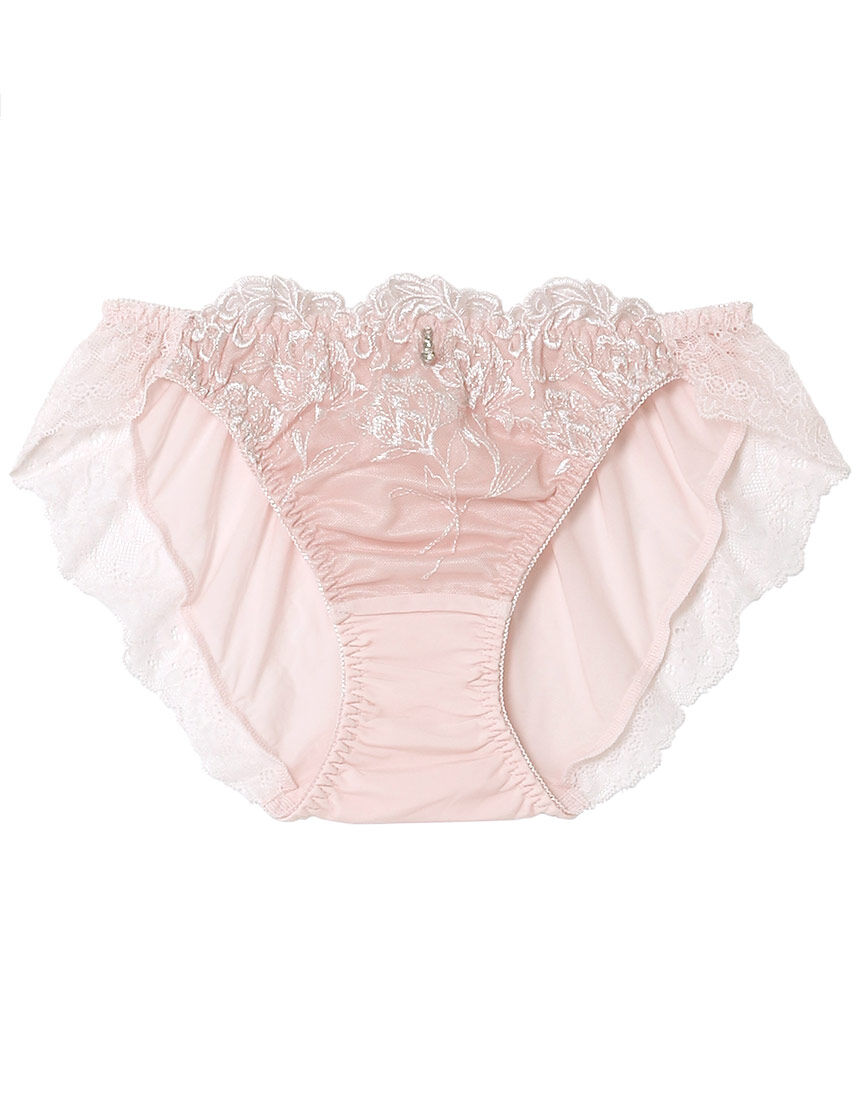 ・本体は綿混素材を使用・ヴェールをまとったような光に佇む花のシルエットを空間を活用した構成で表現した、グレード感のあるデザイン・カラーによりプリントの手法を変え、イメージを変化(GBカラーとPIカラーは、ラメ糸部分のみプリント。OBカラーはプリントなし)・はきこみ丈:ふつうショーツの種類(ウエスト位置、裾ライン位置)についてはこちら をご覧ください。