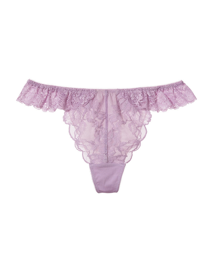Tバックタイプの「ソング」はタイトな服にも下着のラインが出にくく、夏こそ活用したいアイテム。フロントは華やかな柄行きのレースに薄手の生地を裏打ちして透けを軽減。両サイドからバックにかけて、ストレッチレースのフリルがひらりと踊ってキュートです。バック中央は伸びの良い生地で優しいフィット感。