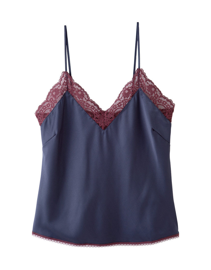 【おすすめポイント】・上品な光沢のサテンと繊細なレースを組み合わせた、定番人気のエレガントなキャミ。・バック上辺にもレースをあしらって、後ろ姿も魅力的。【こんな人、こんな時に】・洋服のインナーに。背中あきのトップスなどに合わせ、見せる着こなしもおすすめ・「レーストリムサテンタップパンツ」とセットアップして部屋着に【デザイン】・「ブラック(BL)」以外は身生地と配色のストレッチレースを使用・バスト脇にダーツをとった立体縫製で、ボディの丸みに自然に沿う・裾にあしらった細幅レースがさりげないアクセント・共生地のストラップにアジャスター付きで調節可◆サイズについてS:バスト72?80cm 総丈約54cm M:バスト79?87cm 総丈約55cm L:バスト86?94cm 総丈約56cm