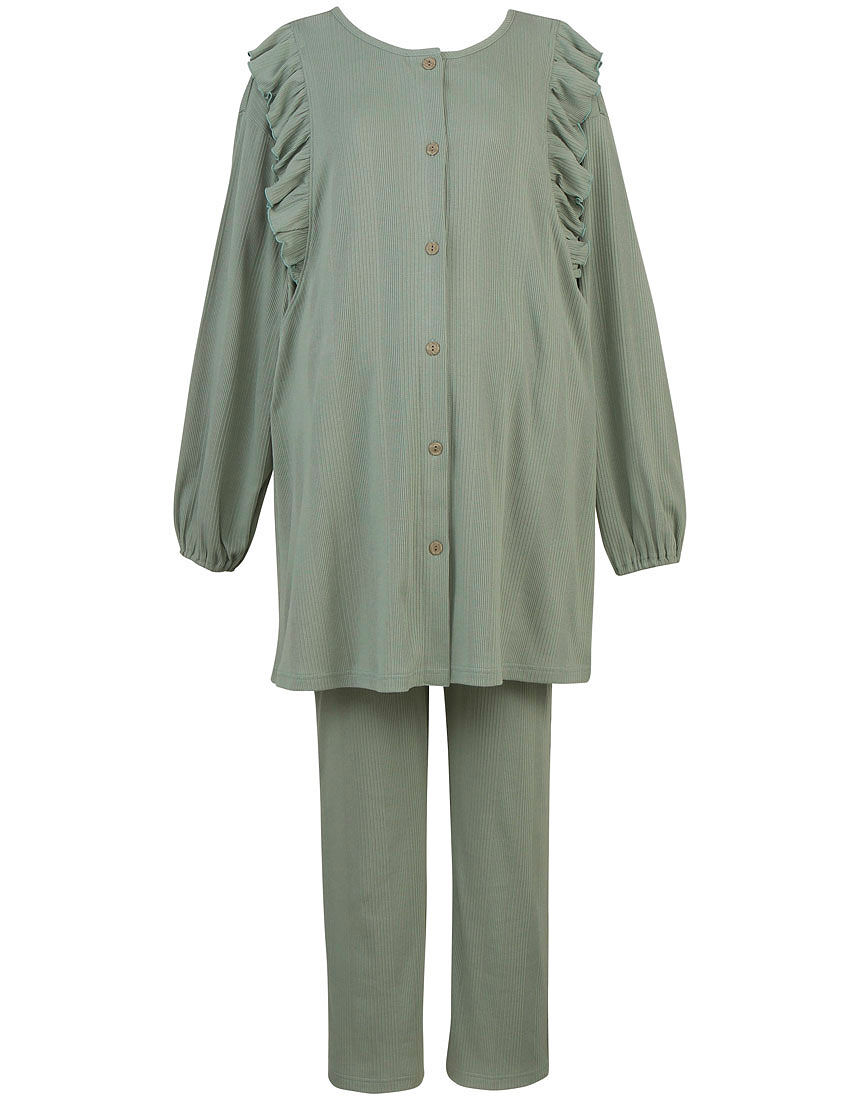 【産前・産後兼用マタニティパジャマ】トップ:長袖 ボトム:長ズボン・マタニティの体型変化を考慮したリラックスシーンにぴったりのパターンで妊娠中も産後も快適に着用できます。・前あきパジャマ。・授乳あき付きの前あきタイプで授乳も簡単です。・ポケット有り。・ボトムはマタニティ用の設計でおなかもすっぽり。・ズボンウエストに高伸度ゴム使用でウエストもラクなはきごこち。・ズボンウエストゴム取り替え口有り。・授乳あき口にフリルをあしらい授乳あきをデザインとして取り入れました。【サイズ詳細】マタニティM-L:着丈76.5cm 肩幅48.0cm ボトム脇丈103.0cm 裾まわり41.0cm 股下(レングス)69.0cm ウエスト66.0cm ヒップ110.5cm※出来上がり寸法を表示しております※サイズ詳細の寸法には多少の差異がございます出来上がり寸法の測り方についてはこちら