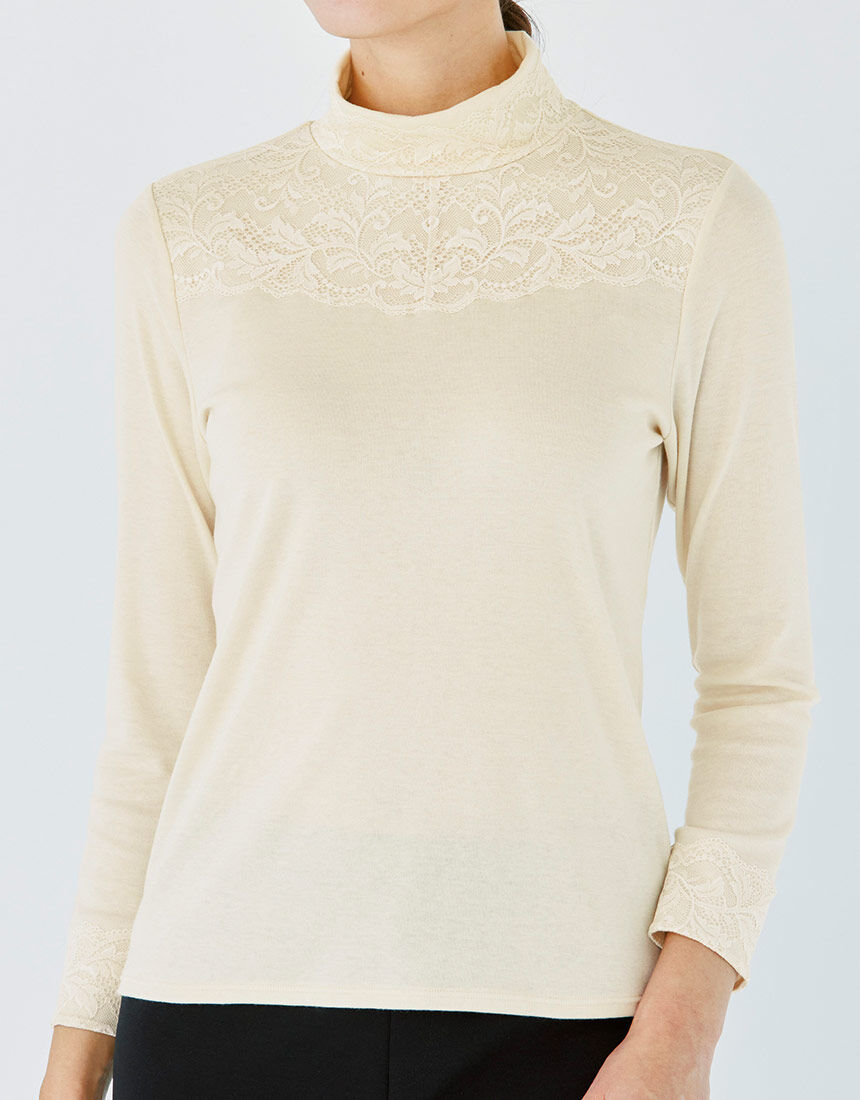 ハイネックと前身頃のヨーク、袖口にレースを重ねた上品に華やぐ、重ね着映えするデザインです。LOVE BODY 2023冬号 P73-1に掲載されています。