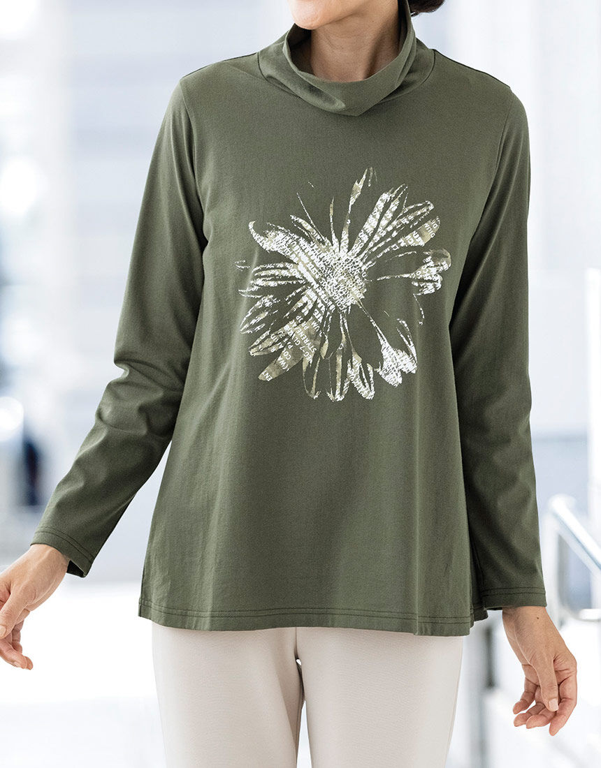 1枚で着映えするプリントトップスナチュラルな風合いの綿100%カットソー。首もとをゆったり包むオフタートルとかすれ調のプリントが魅力です。LOVE BODY 2023冬号 P36-4に掲載されています。