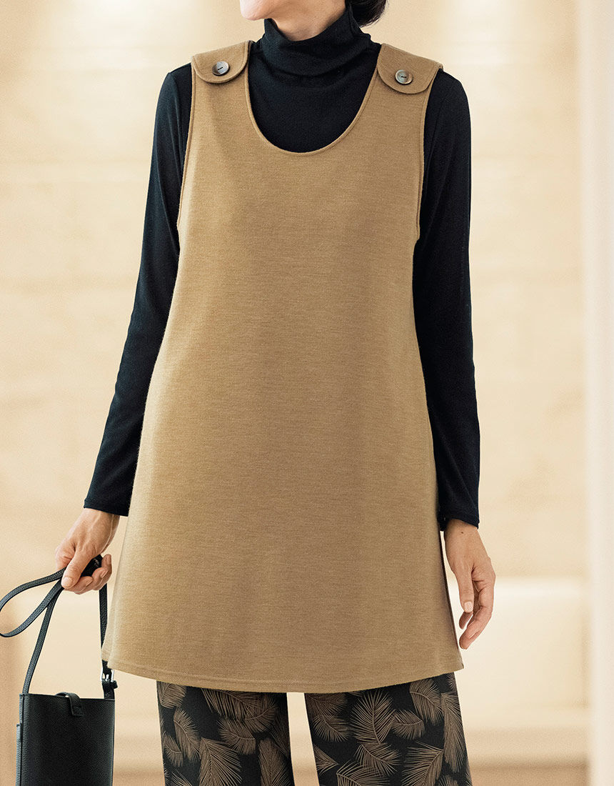 ぬくもり感あるカットソーのベスト肩の飾りボタンがアクセントのシンプルなデザイン。ここちよく重ね着が楽しめるすべりのよい裏地付です。LOVE BODY 2023冬号 P38-3に掲載されています。