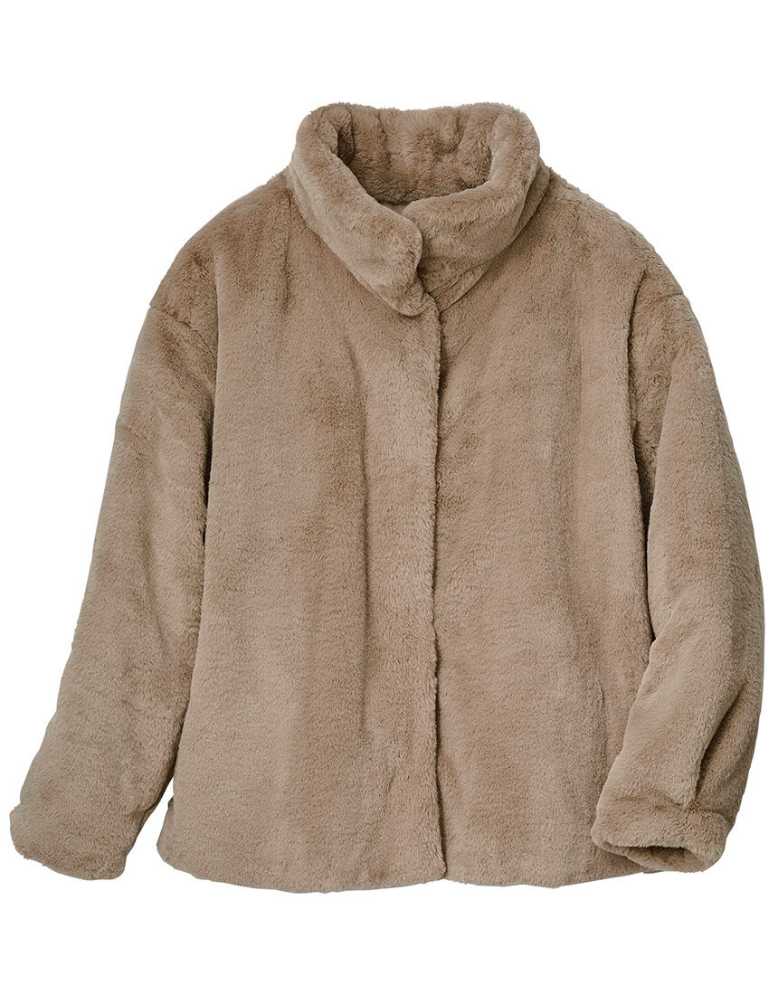 上質なフェイクファーの毛並が美しいボアジャケット首もとをふんわり包むスタンド襟。袖口と後ろ裾にタックを入れ、まるみをもたせたシルエットがやさしい印象です。LOVE BODY 2023冬号 P9-1に掲載されています。
