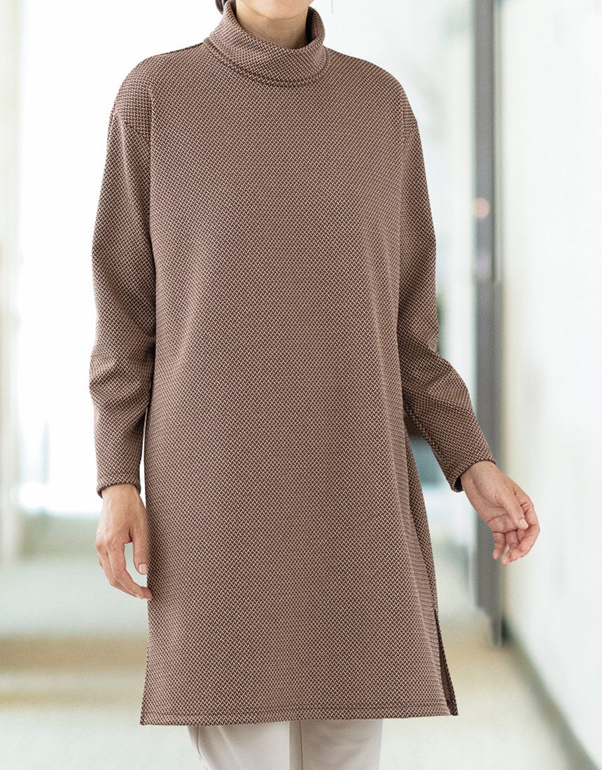 ストンと着てサマになるチュニック4色の糸で深みをだした緻密なジャカード柄が素敵。端正なタートルネックで深めスリット入りのロング丈。LOVE BODY 2023冬号 P37-1に掲載されています。
