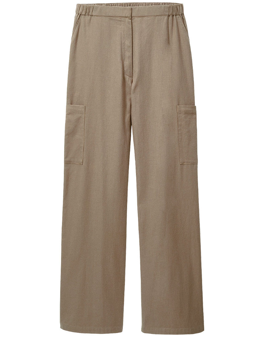 軽い起毛感があるソフトな綿100%素材大人に似合うポケット高め位置のきれいめカーゴパンツ。きちんと見える前開きでウエストは前脇?後ゴムです。LOVE BODY 2023冬号 P44-4に掲載されています。